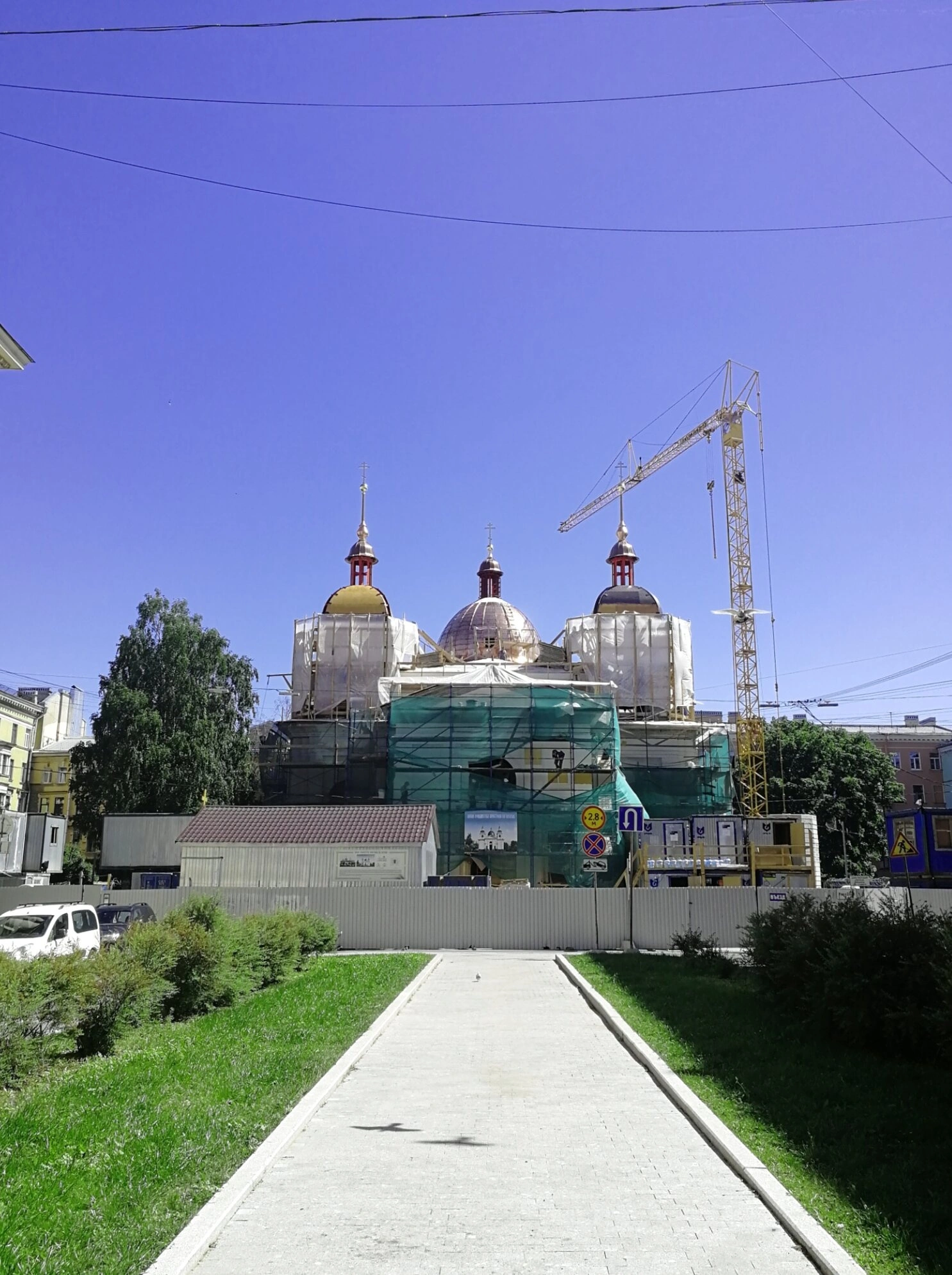 Храм, освящённый в честь Рождества Христова, представляет собой выдающийся образец русской церковной архитектуры. На снимке хорошо различимы три медных купола, венчающих здание: центральный, более крупный, и два боковых меньшего размера. Позолоченные кресты, вознесённые над куполами, символизируют победу жизни над смертью и напоминают о искупительной жертве Спасителя.