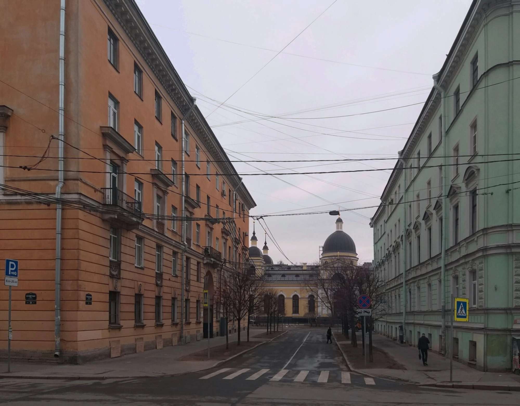 Композиция фотографии выстроена таким образом, что взгляд зрителя направлен вдоль 5-й Советской улицы в сторону Красноборского переулка, где величественно возвышается церковь. Центральное место в кадре занимает главный купол храма, увенчанный православным крестом, который символически устремляется к небесам. По обе стороны улицы расположены характерные для Петербурга многоэтажные жилые здания: слева – дом с желтым фасадом, справа – здание светло-зеленого цвета, создающие гармоничное обрамление для храмовой архитектуры.