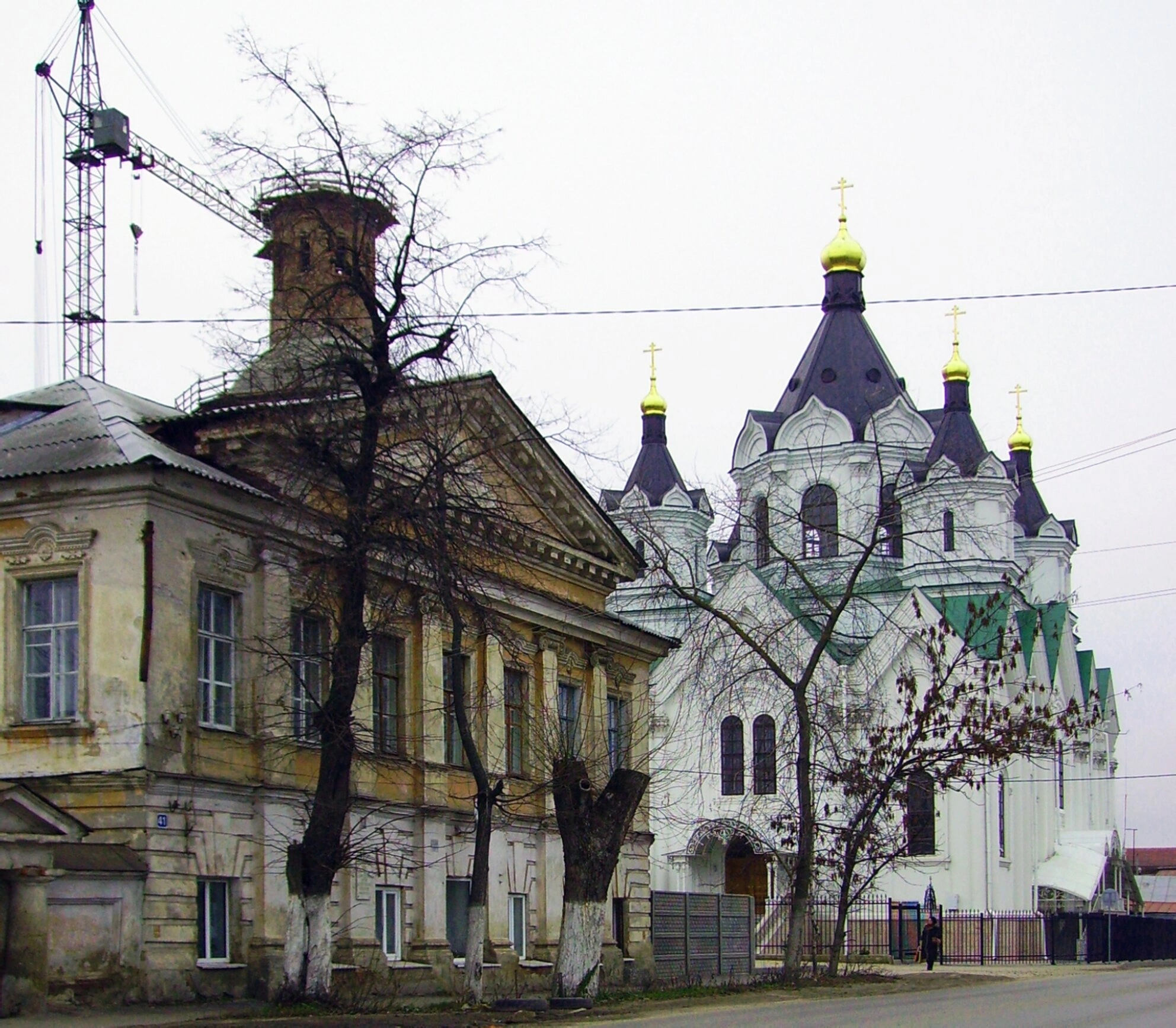 На переднем плане фотографии виднеются старые городские постройки, вероятно, жилые дома или административные здания XIX – начала XX века. Их фасады, с облупившейся от времени штукатуркой, и голые ветви деревьев создают ощущение некой временной грани, отделяющей мирскую суету от духовного величия. Слева от них присутствует строительный кран, свидетельствующий о непрекращающейся жизни города и ведущихся работах.