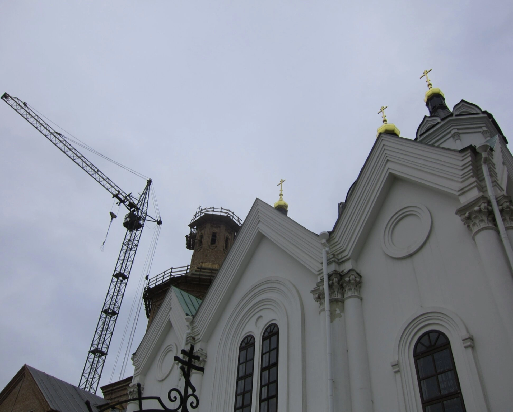 Примечательной деталью кадра являются строительные леса, окружающие одну из глав церкви, и строительный кран, виднеющийся слева от здания. Это свидетельствует о проведении масштабных реставрационных или восстановительных работ, направленных на сохранение этого духовного и архитектурного сокровища для будущих поколений. Подобная забота о храме – это благое дело, продолжающее многовековую традицию попечения о доме Божием.
