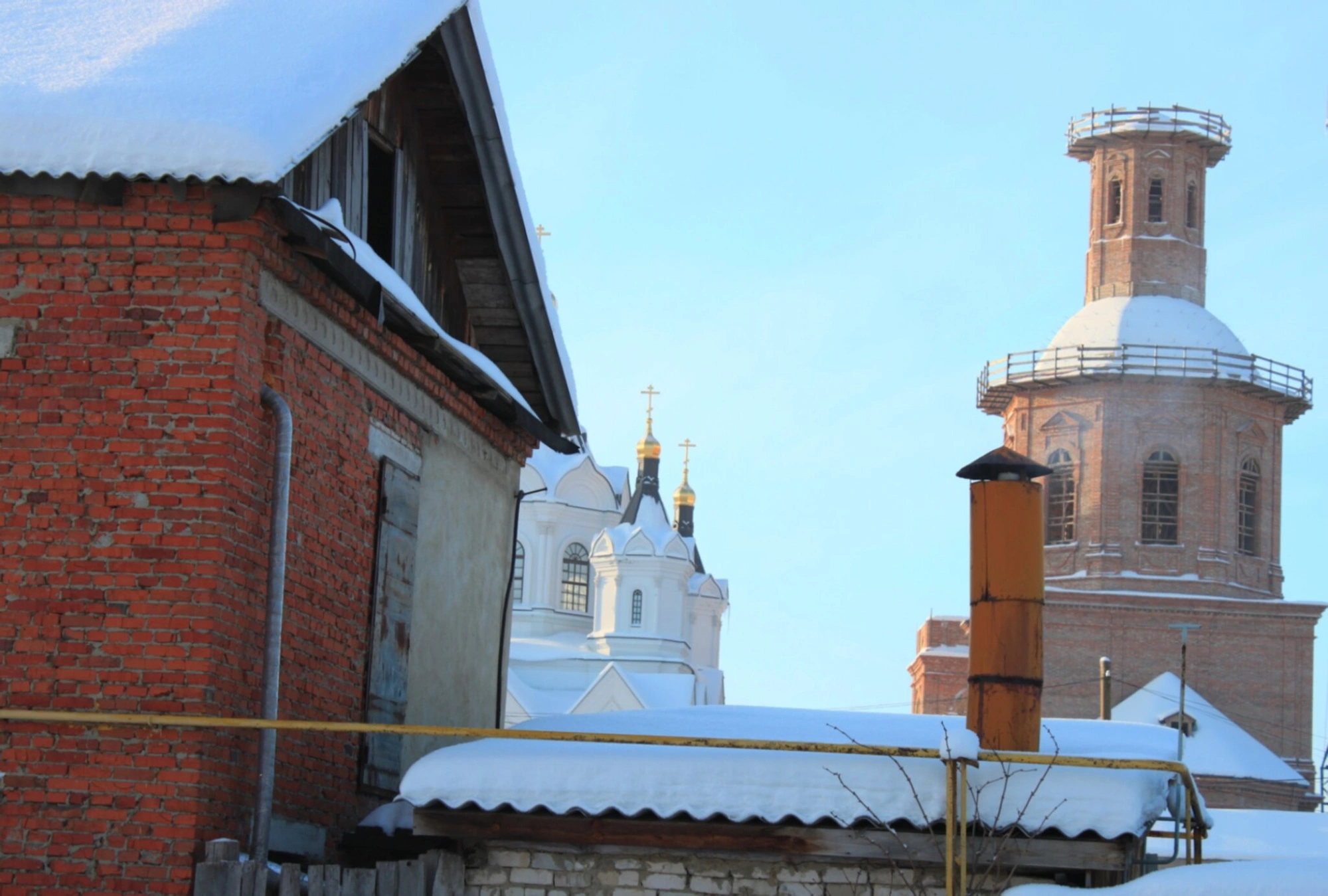 На переднем плане слева виден угол кирпичного здания, вероятно, одного из городских строений, характерных для застройки Арзамаса XIX века. Центром композиции и главным объектом снимка являются купола и высокая колокольня Христорождественской церкви. Пятиглавый храм и стройная колокольня, увенчанная шпилем, ярко выделяются на фоне зимнего неба. Снег обильно покрывает все поверхности, подчёркивая тихую и благоговейную атмосферу святого места.