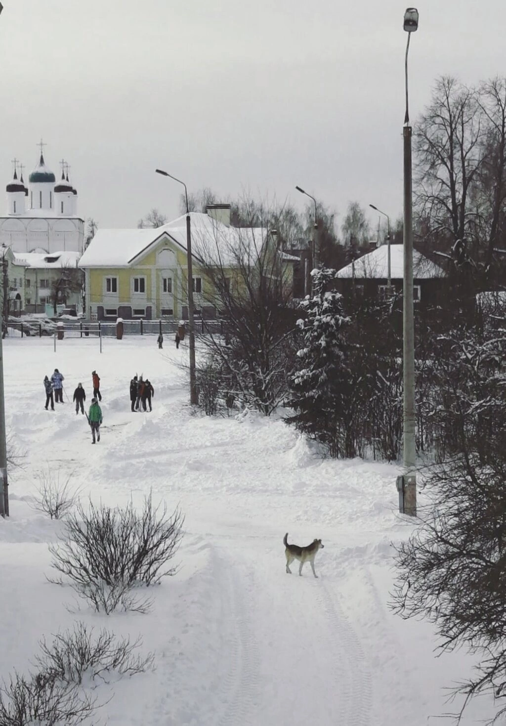 На заднем плане возвышается сам храмовый комплекс. Чётко видны зелёные купола церкви, увенчанные православными крестами, сияющими в зимнем воздухе. Рядом располагается светлое здание жёлтого цвета, вероятно, церковная лавка или административное строение. Глубокий снег покрывает землю, ветви деревьев склонились под его тяжестью, а несколько человек, идущих по двору, свидетельствуют о том, что жизнь прихода не замирает даже в холодное время года.