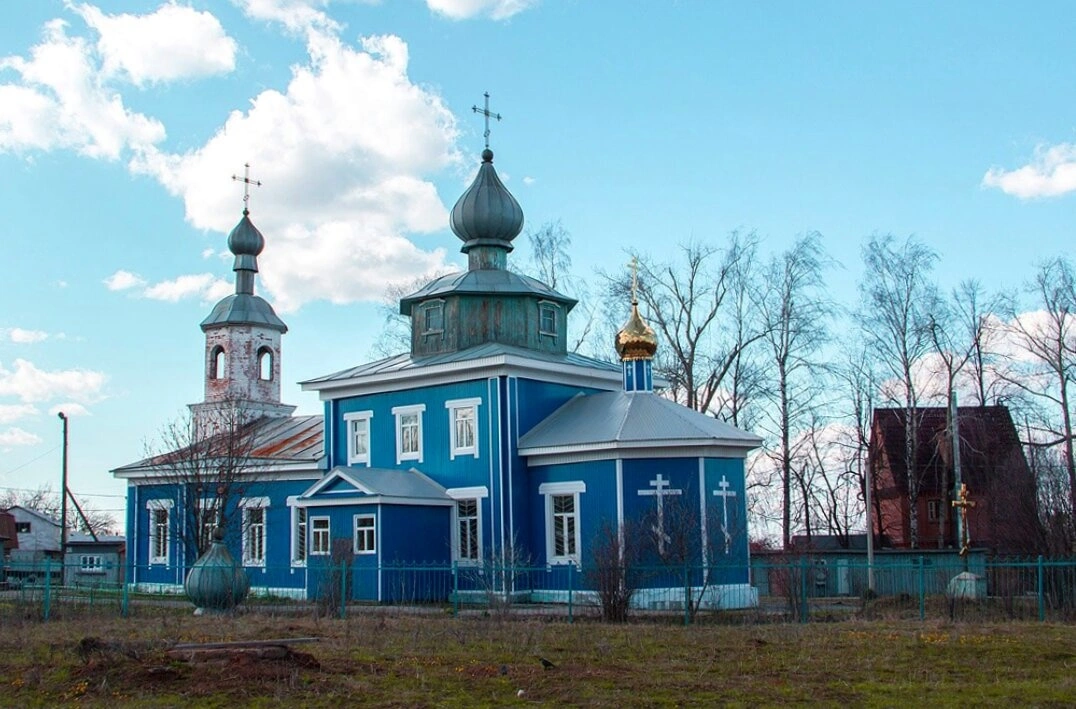 Здание храма окрашено в глубокий синий цвет, который в православной традиции часто символизирует небесную чистоту и Божественную благодать. Оконные рамы и наличники выкрашены в белый цвет, создавая благолепный контраст и подчёркивая чистоту линий. Храм завершается двумя куполами: главный купол над центральным объёмом покрыт серым металлом и увенчан православным восьмиконечным крестом, а над алтарной частью находится купол золотистого оттенка, также завершающийся крестом. Неподалёку от основного здания возвышается двухъярусная колокольня с арочными проёмами, увенчанная серым куполом с крестом, что является характерным элементом для храмов данной местности.