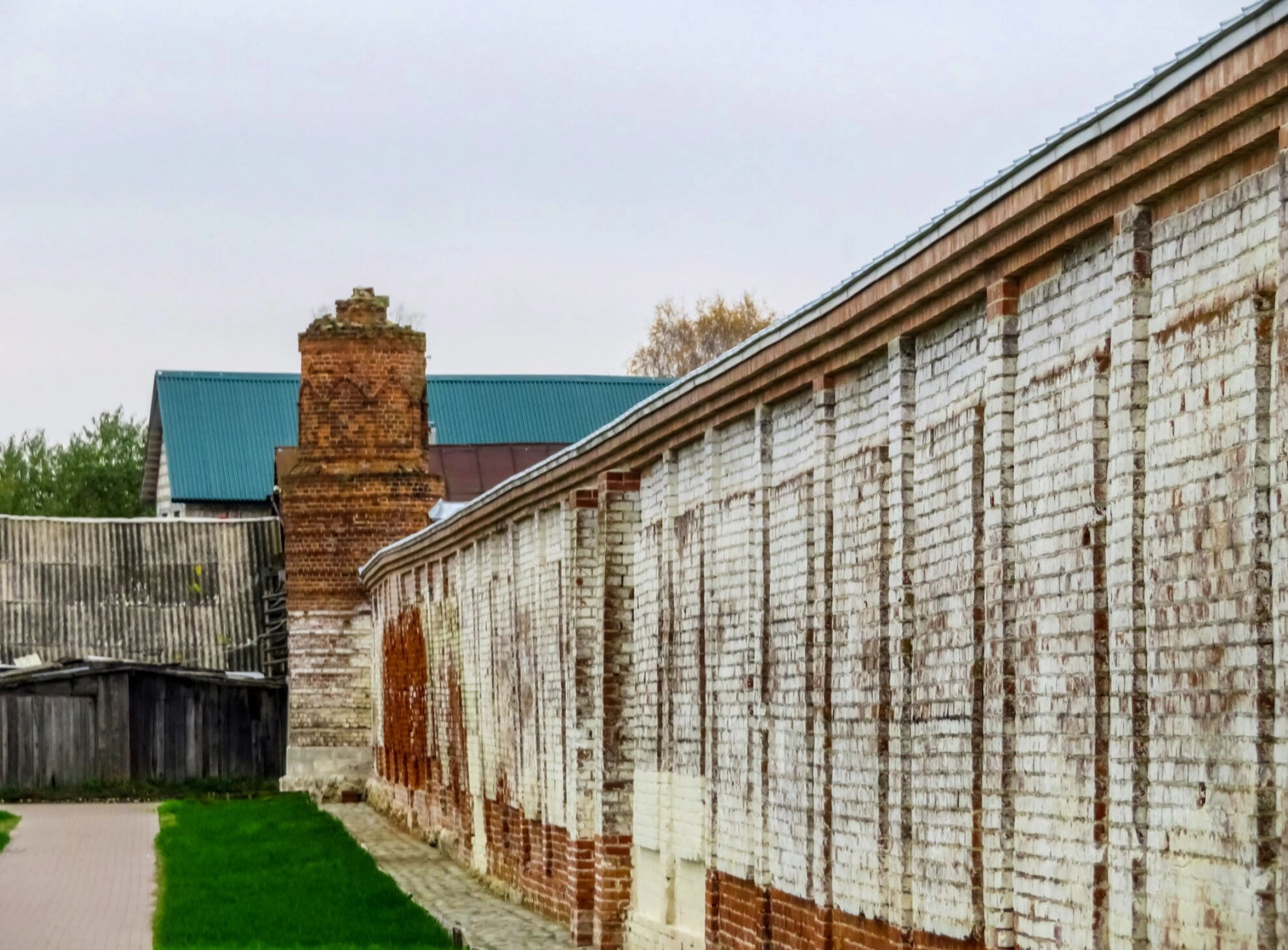 На переднем плане изображена протяженная кирпичная ограда монастырского комплекса, выполненная из красного кирпича и частично покрытая побелкой. Кладка сохранила следы времени - побелка местами облупилась, обнажая аутентичную поверхность стен. Вдоль ограды пролегает мощеная дорожка, обрамленная полосой зеленой травы, что создает гармоничный природно-архитектурный ансамбль.