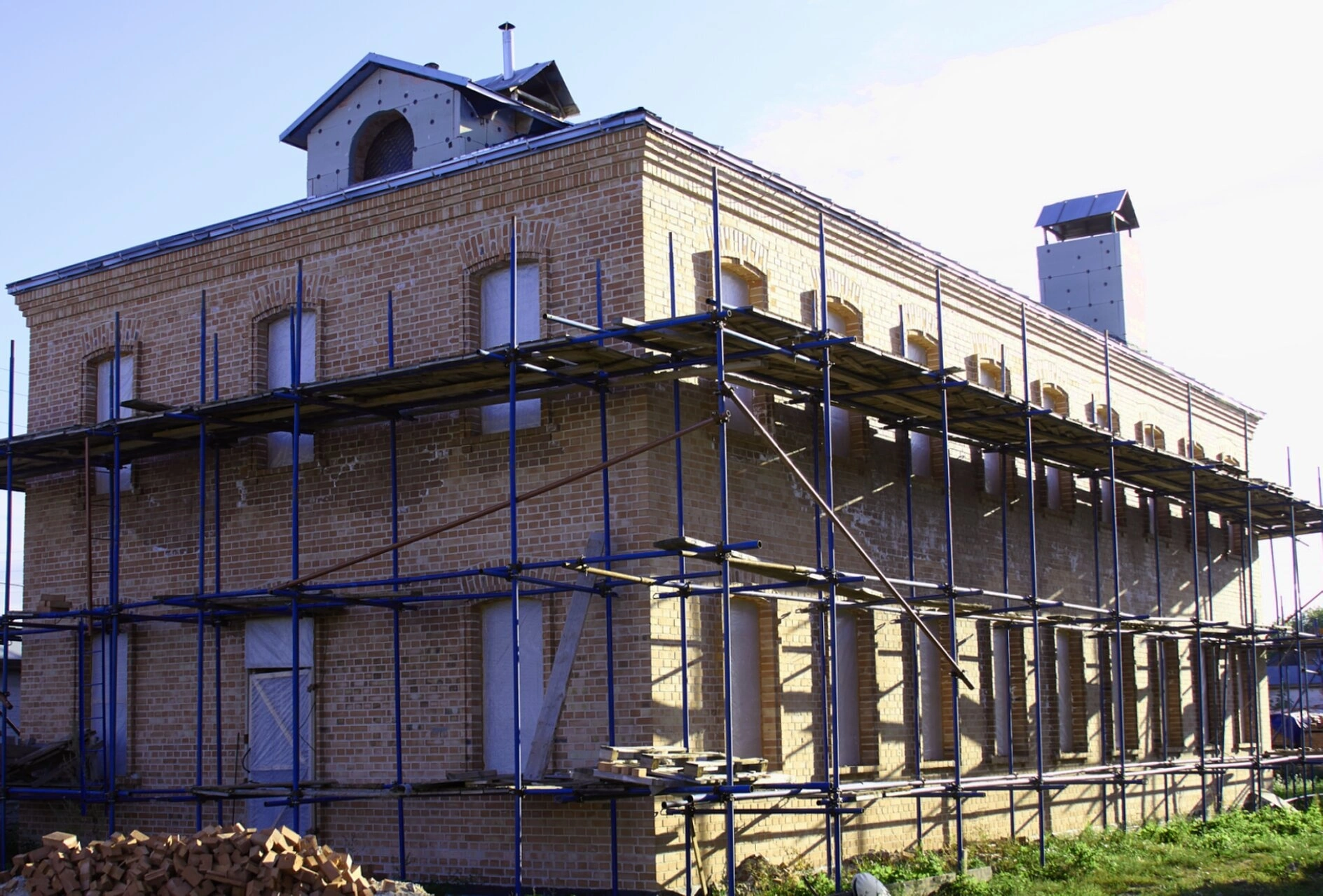 Основной объём церкви выполнен из красного кирпича, характерного для церковной архитектуры конца XIX века. Арочные оконные проёмы временно закрыты защитными материалами, что обеспечивает сохранность внутренних помещений во время проведения восстановительных работ. В левой части кадра виднеется штабель кирпичей, предназначенный для ремонтных нужд.