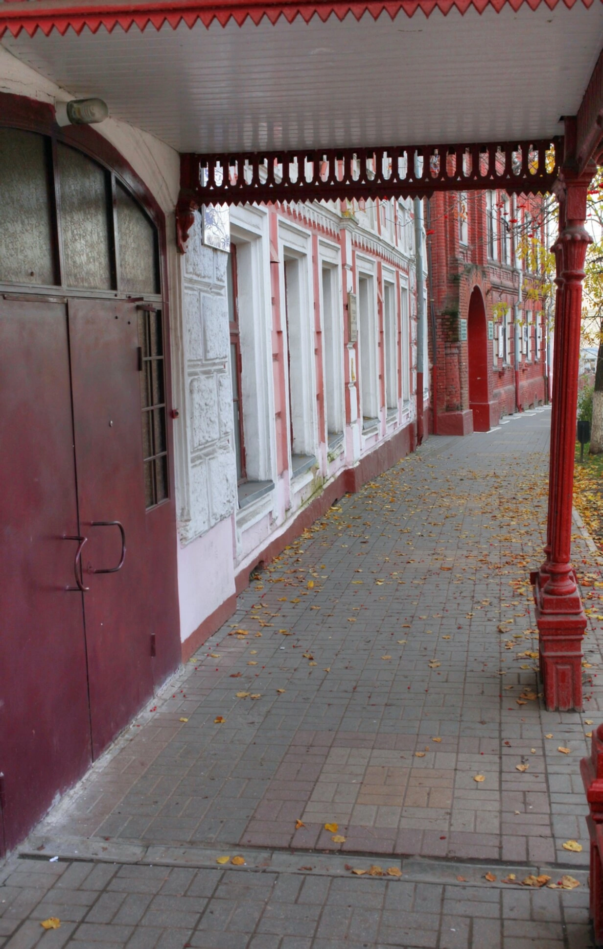 Архитектурное убранство дополняет протяженный красный навес с резным декоративным узором, поддерживаемый колоннами того же цвета. Такие элементы характерны для оформления входных групп православных храмов, обеспечивая защиту от непогоды и создавая торжественный вход в дом Божий. Цветовое решение фасадов в красных и белых тонах соответствует канонической палитре православного церковного зодчества.