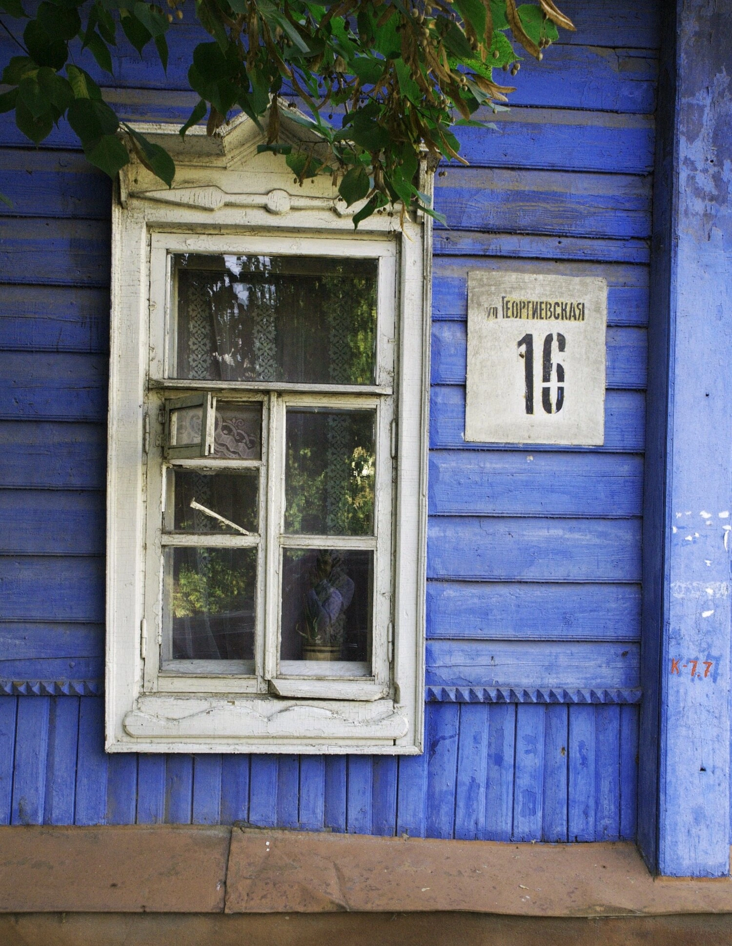За стеклом окна просматривается церковная занавеска, придающая интерьеру уединённость и молитвенную атмосферу. На стене справа от оконного проёма сохранились исторические обозначения, включая надпись «К-777». Ветви деревья с листьями, обрамляющие фасад сверху и сбоку, создают естественное обрамление для архитектурного памятника, подчёркивая его гармоничное единство с природным окружением.
