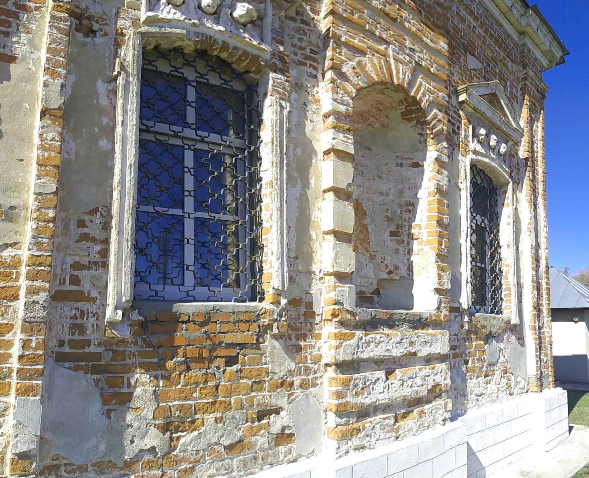 Кирпичная кладка стены сохранила следы многолетней истории: видны участки реставрационных работ, где более светлый кирпич указывает на восстановительные мероприятия. Текстура старого кирпича и местами проступающие следы разрушения создают особую атмосферу духовного памятника, пережившего разные эпохи.