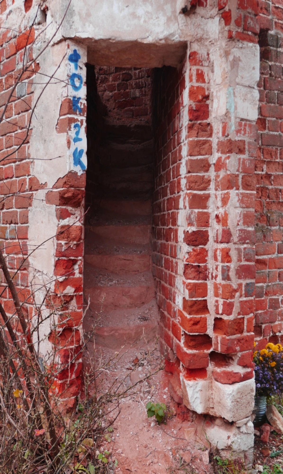 На снимке отчетливо видна массивная кирпичная кладка, характерная для цокольных помещений храмовых построек. Кирпичи, выполненные в традиционном красном цвете, несут на себе следы времени - некоторые элементы кладки подверглись естественному разрушению, что свидетельствует о почтенном возрасте сооружения. Примечательно наличие следов ремонтных работ в виде белого известкового раствора, что указывает на периодические попытки сохранения исторического облика храма.