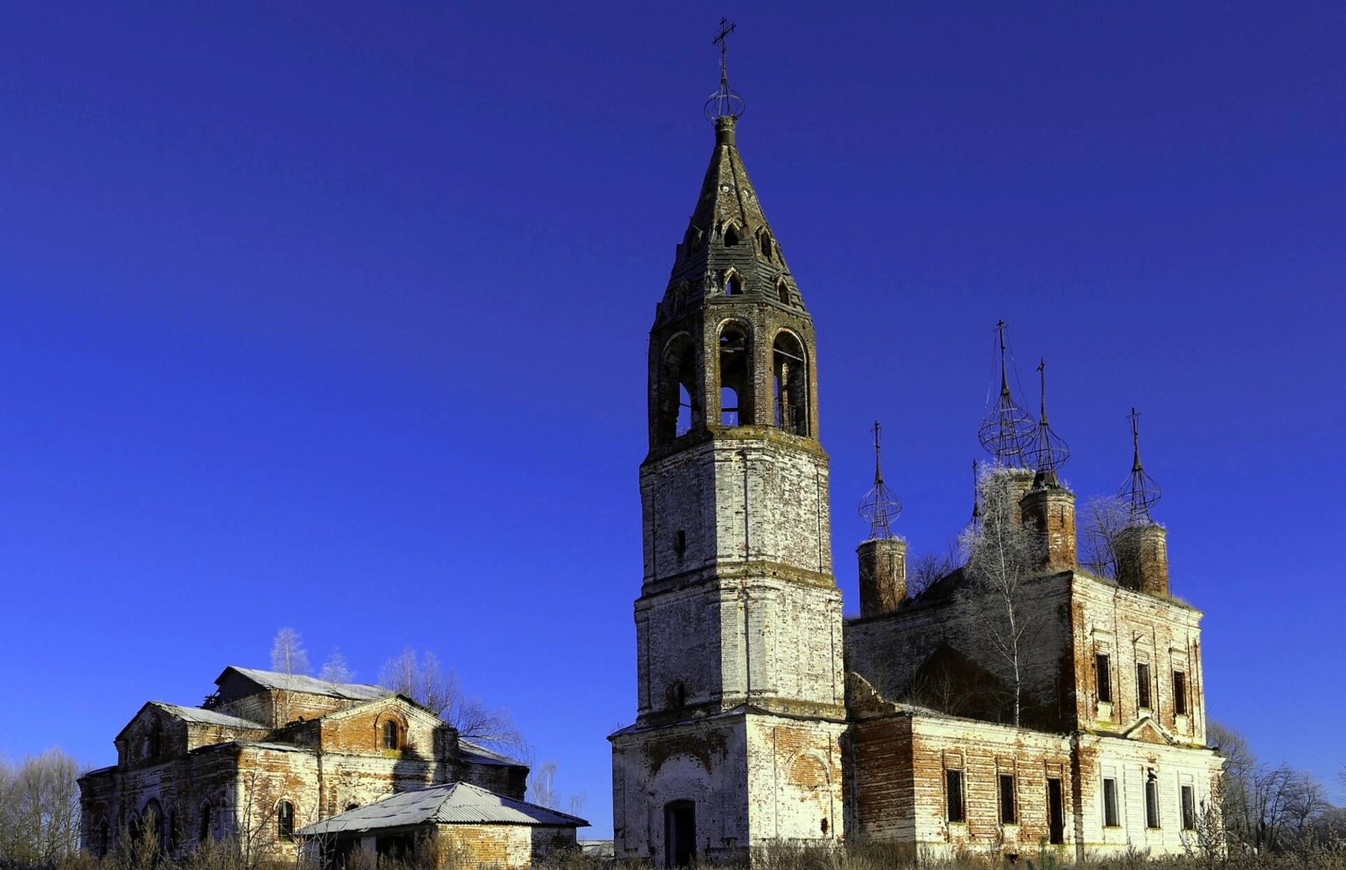 Колокольня, являющаяся архитектурной доминантой комплекса, завершается стройным шатром с декоративной главкой, что характерно для русской храмовой архитектуры указанного периода. Несмотря на нынешнее состояние разрушения, на фотографии отчетливо прослеживаются благородные пропорции и изящество архитектурных форм, присущие лучшим образцам церковного зодчества Центральной России.