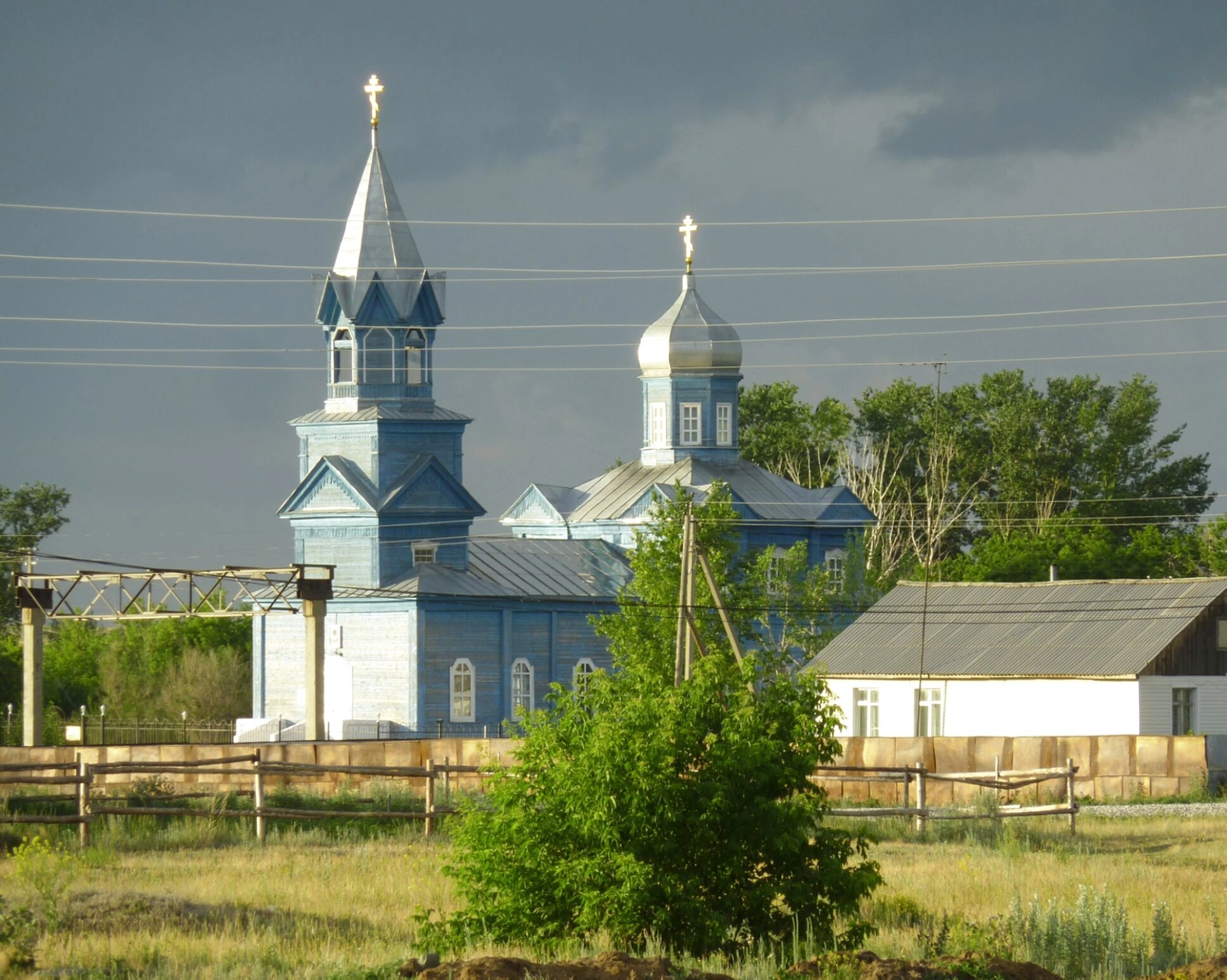 Окружающий храм пейзаж составляют деревянное ограждение на переднем плане, поле с травой и кустарниками, а также жилой дом справа от церкви. Над зданиями видны провода линий электропередач, а слева — часть металлической конструкции. Несмотря на присутствие современных элементов, фотография передаёт умиротворённую атмосферу и духовную значимость этого места, которое является объектом культурного наследия Челябинской области.