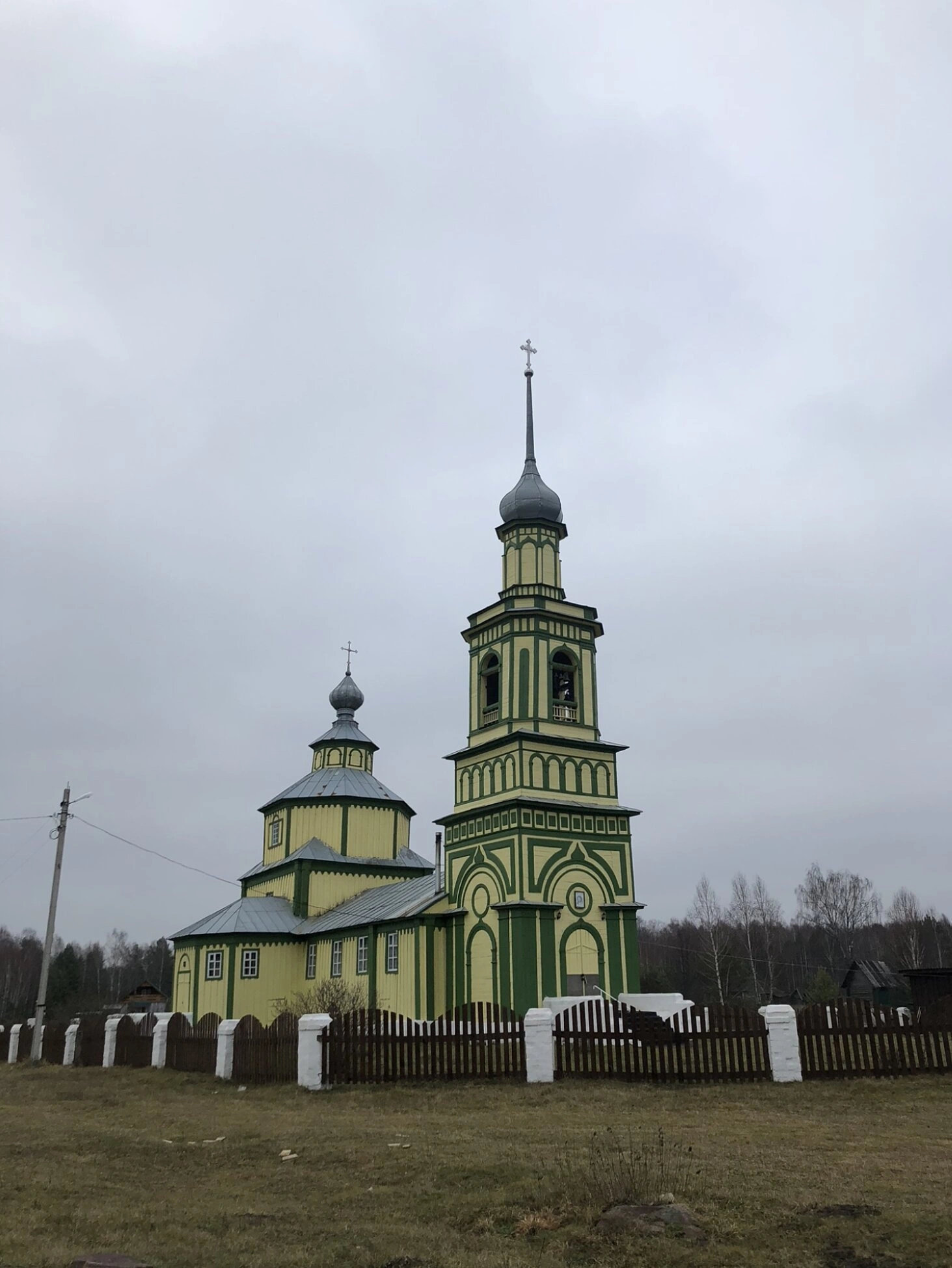 Деревянная церковь представляет собой образец традиционного храмового зодчества. Здание окрашено в желтый цвет, а декоративные элементы и крыши выделены зеленым. Архитектурная композиция включает основной объем храма и многоярусную колокольню, увенчанную шпилем с крестом. По историческим данным, храм был построен в период с 1783 по 1795 год.