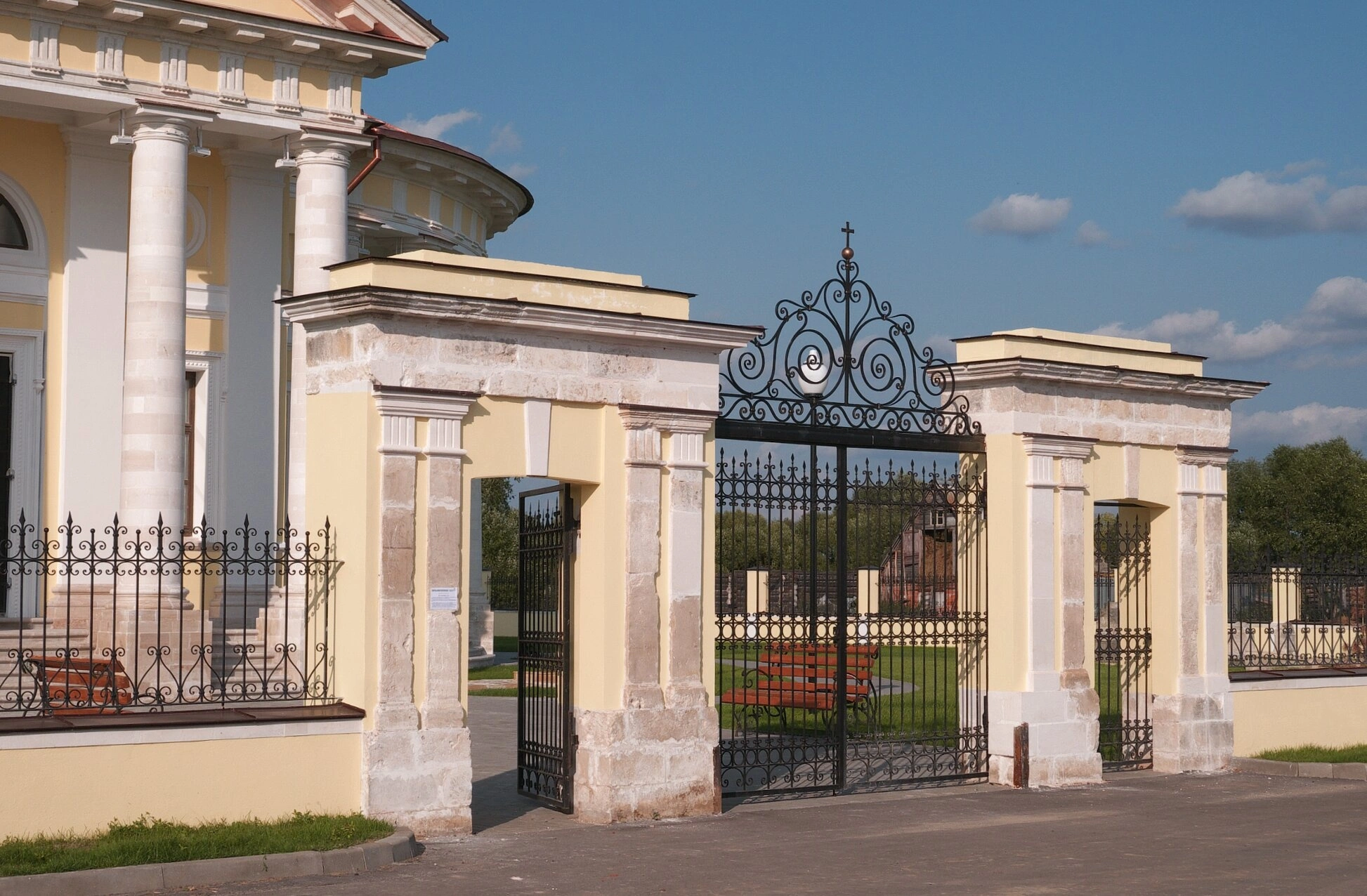 Центральное место в композиции занимают величественные кованые ворота, украшенные ажурным узором и увенчанные православным крестом. Ворота встроены в каменную арку, что подчеркивает их монументальность и значимость как элемента церковной ограды. По обе стороны от ворот установлена кованая ограда, выполненная в едином стилистическом решении, что завершает архитектурный ансамбль.