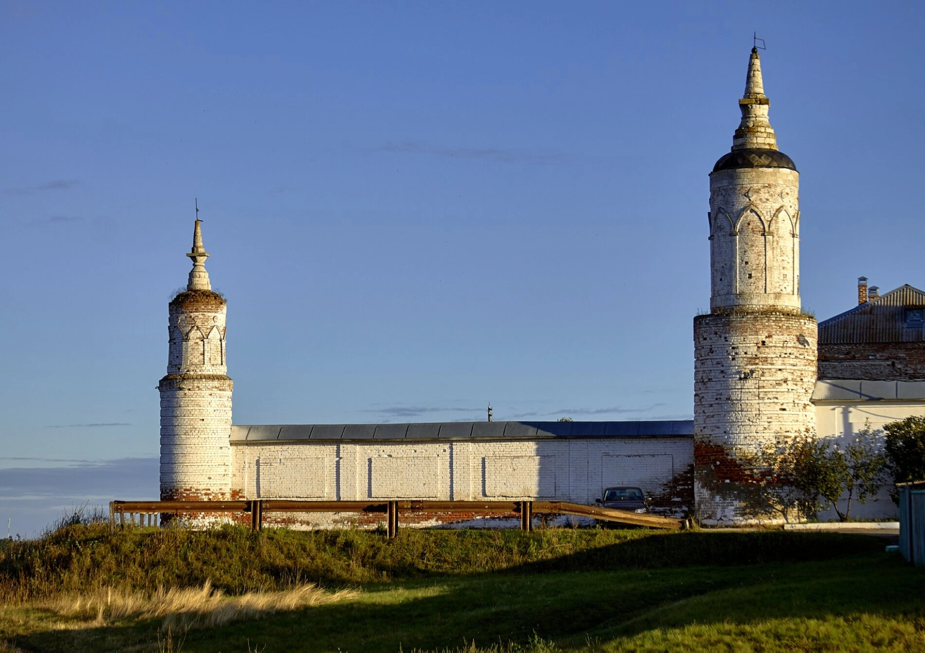 На переднем плане фотографии видны две монументальные колокольни, выполненные из белого кирпича. Башни имеют характерные шатровые завершения, традиционные для русской церковной архитектуры. Состояние колоколен свидетельствует о их почтенном возрасте - на поверхности заметны следы времени, что придаёт сооружению особую историческую ценность.