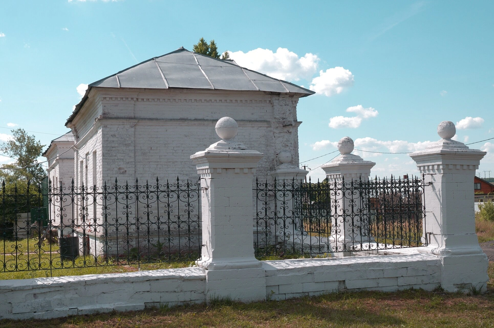 Территория храма обнесена невысокой оградой из белого кирпича с коваными металлическими решётками. По периметру ограды установлены массивные кирпичные столбы, на двух из которых, расположенных ближе к foreground, размещены декоративные элементы в виде сфер, что придаёт ограде особую выразительность.