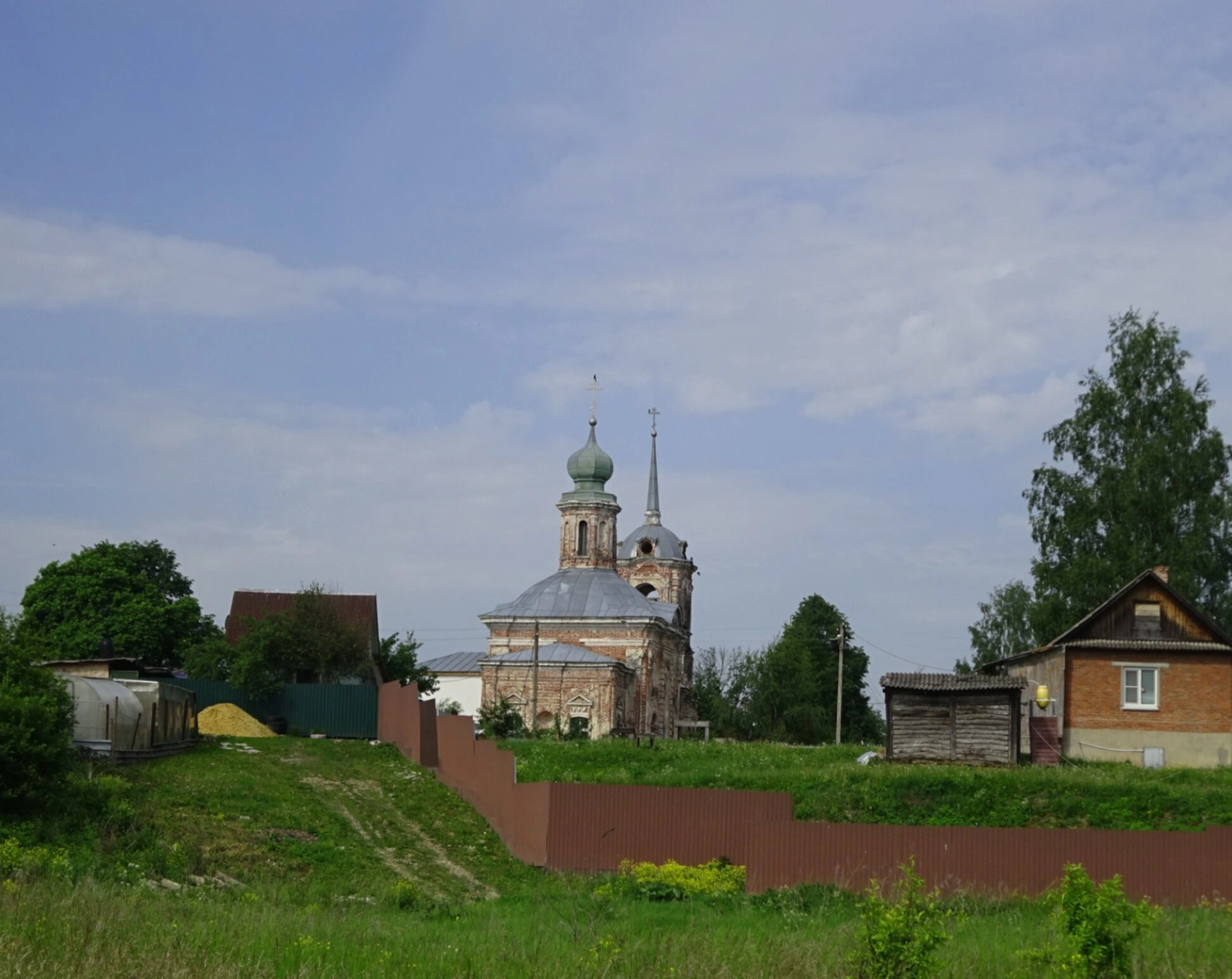 На заднем плане просматриваются скромные сельские дома, что подчёркивает расположение храма в сельской местности и его значение как духовного центра для местных жителей. Небо на снимке светлое с облаками, что создаёт мягкое естественное освещение и придаёт фотографии особую атмосферу умиротворения.