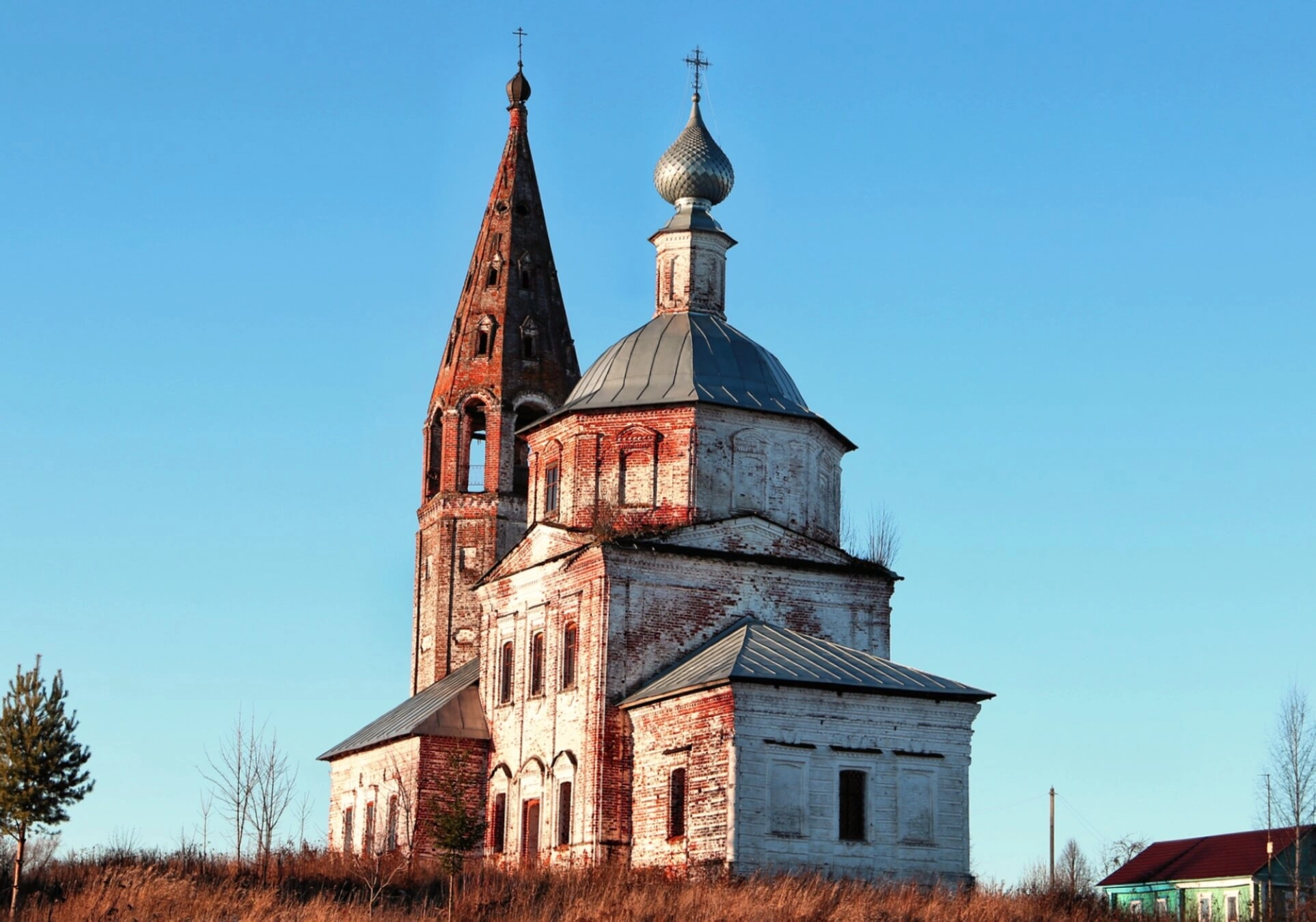 Храм находится на возвышенности, что подчеркивает его доминирующее положение в окружающем ландшафте. Местность вокруг церкви характеризуется сухой травой и редкими деревьями, создающими особую атмосферу духовного уединения. На заднем плане просматривается скромный деревянный дом с синей крышей, что добавляет кадру элемент деревенского быта.
