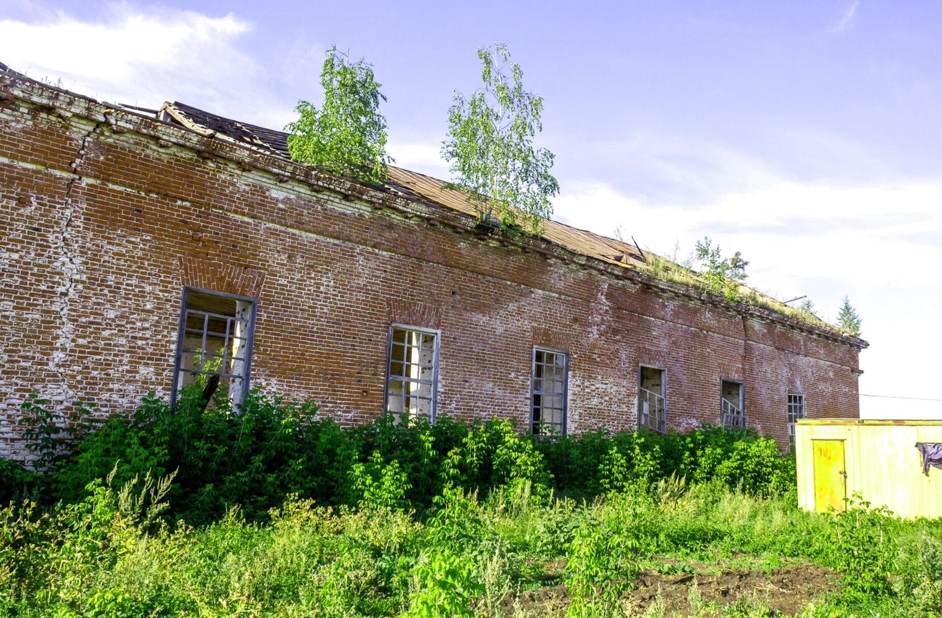 На представленной фотографии запечатлена Церковь Рождества Христова, расположенная в селе Полховский Майдан Нижегородской области. Святыня находится в плачевном состоянии: кирпичные стены значительно обветшали, полностью отсутствует кровля и оконные заполнения.