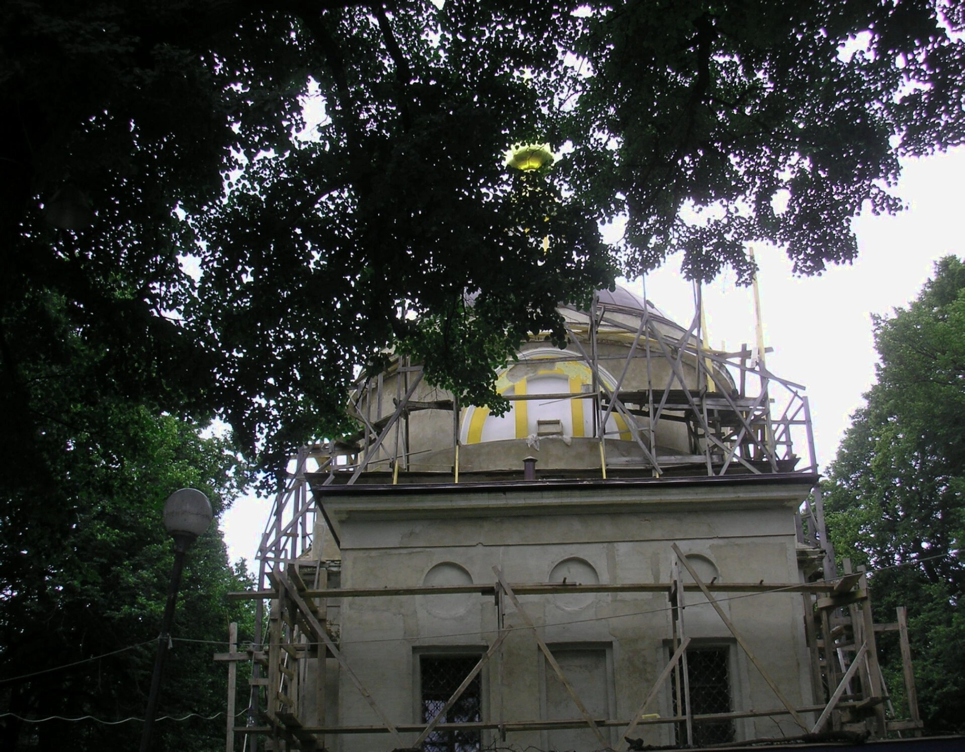 На представленной фотографии запечатлена Церковь Рождества Христова, расположенная в селе Рождествено Московской области. Святыня находится в процессе комплексной реставрации, о чём красноречиво свидетельствуют установленные по всему её периметру строительные леса. Несмотря на это, величественный золочёный купол храма, увенчанный православным крестом, горделиво возвышается над временными конструкциями, символизируя неизменность веры и надежду на возрождение.