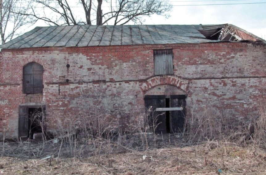 Вокруг храма просматривается заросшая территория с сухой травой и кустарниками, что свидетельствует о длительном отсутствии должного ухода и благоустройства. Несмотря на плачевное состояние, здание сохраняет свои архитектурные формы и продолжает оставаться важным историко-культурным объектом региона.