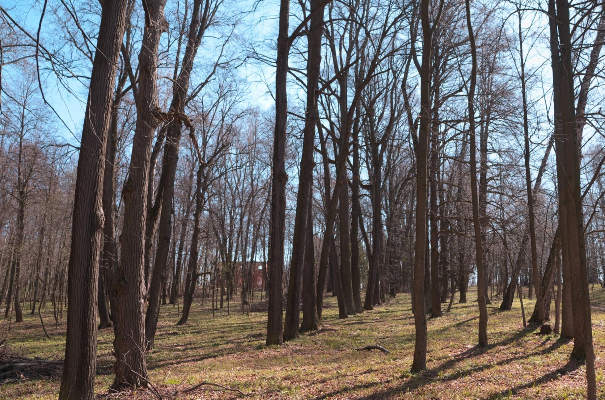 Снимок выполнен в парковой зоне усадьбы в межсезонье, о чём свидетельствуют деревья с обнажёнными ветвями на переднем плане. Сквозь ажурный переплетение крон и стволов открывается вид на храмовое здание, что создаёт особое молитвенное настроение и подчёркивает гармонию божественного творения и природной красоты.