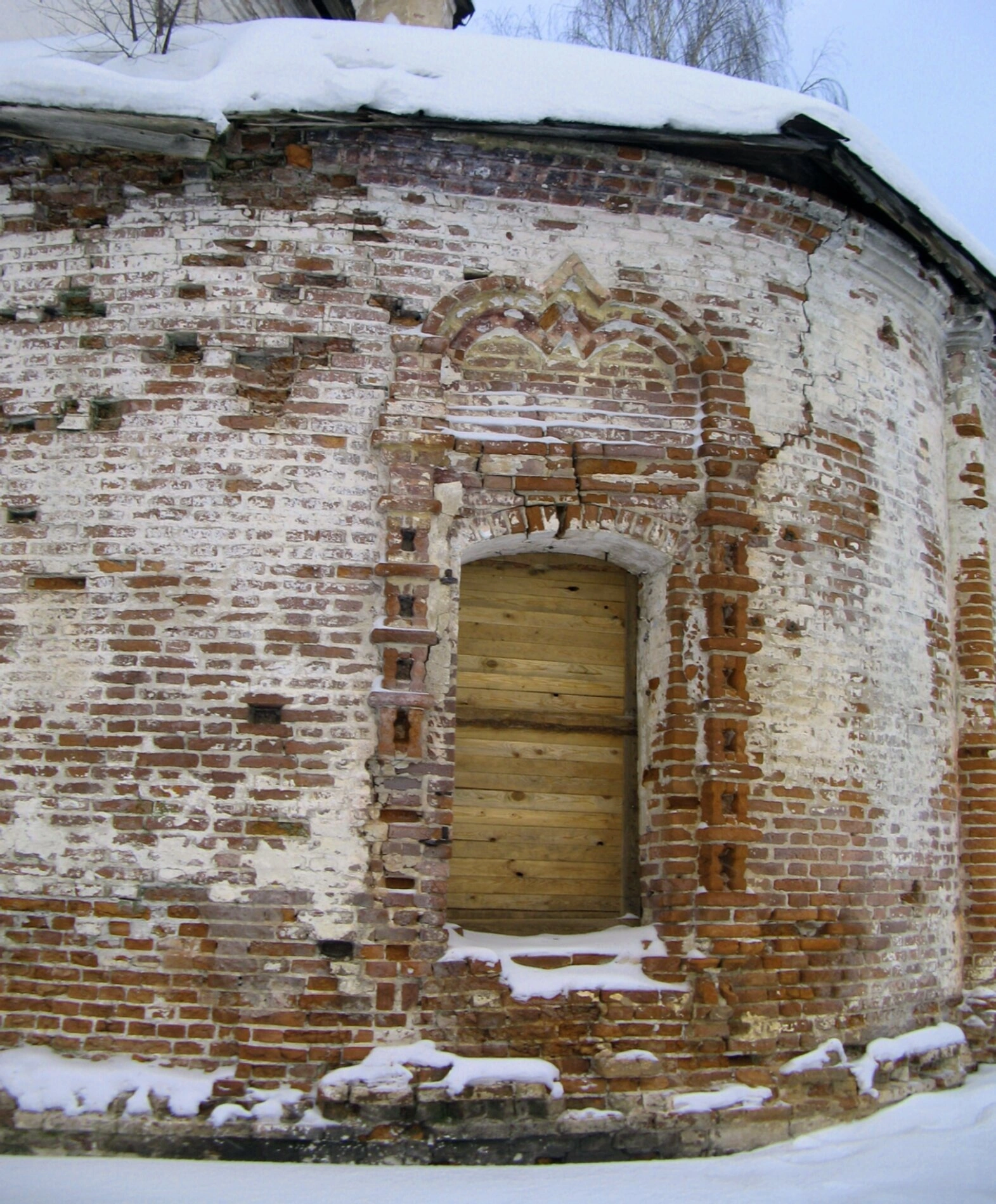 На снимке изображён фрагмент стены святыни, сложенной из красного кирпича с элементами декоративной кладки. Хорошо просматриваются характерные архитектурные детали: заложенный досками арочный проём и декоративные элементы над ним, напоминающие традиционные кокошники. Фотография передаёт особую атмосферу зимнего умиротворения: белый снег покрывает кровлю храма и его основание, создавая прекрасный контраст с тёплым цветом кирпичных стен.