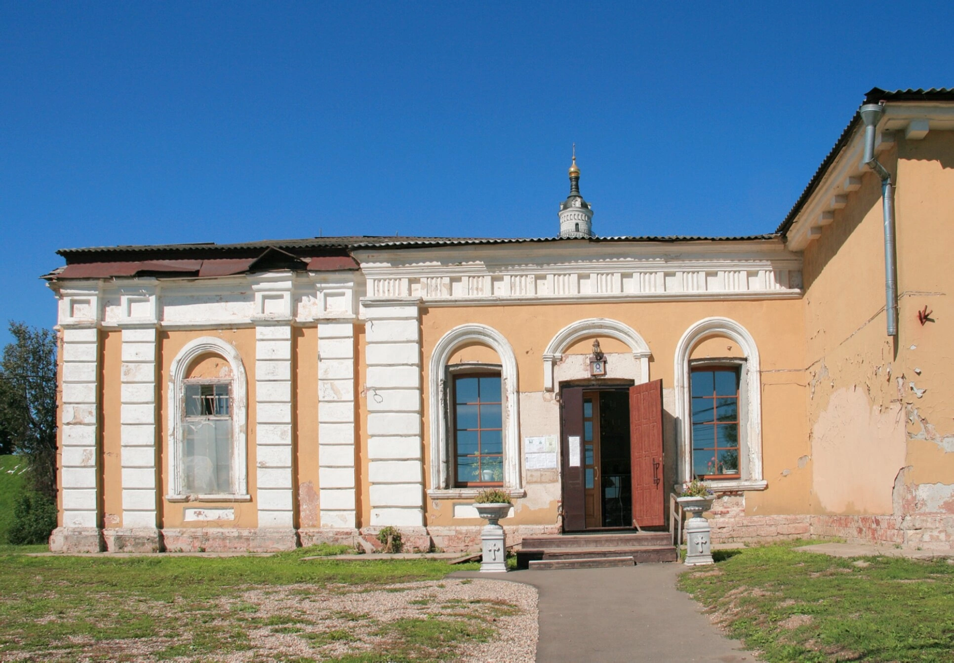Фасад здания окрашен в светлые охристые тона с выразительными белыми архитектурными деталями. На фото хорошо видны следы времени - местами краска облупилась, обнажая кирпичную кладку, что придает храму особую атмосферу духовной преемственности поколений. Архитектурную композицию украшают изящные пилястры с капителями, поддерживающими антаблемент, арочные окна обрамлены строгими белыми наличниками.