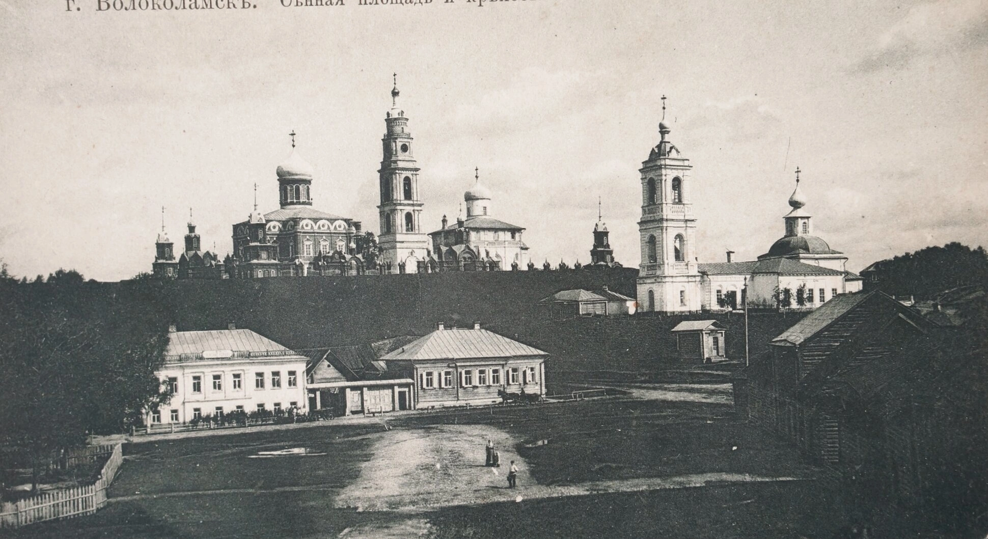 На представленной исторической фотографии запечатлен архитектурный ансамбль Волоколамского кремля, расположенный на древнем крепостном валу. На переднем плане открывается вид Сенной площади с грунтовыми дорогами, где можно различить несколько человеческих фигур, что придает снимку особую живость и историческую достоверность.