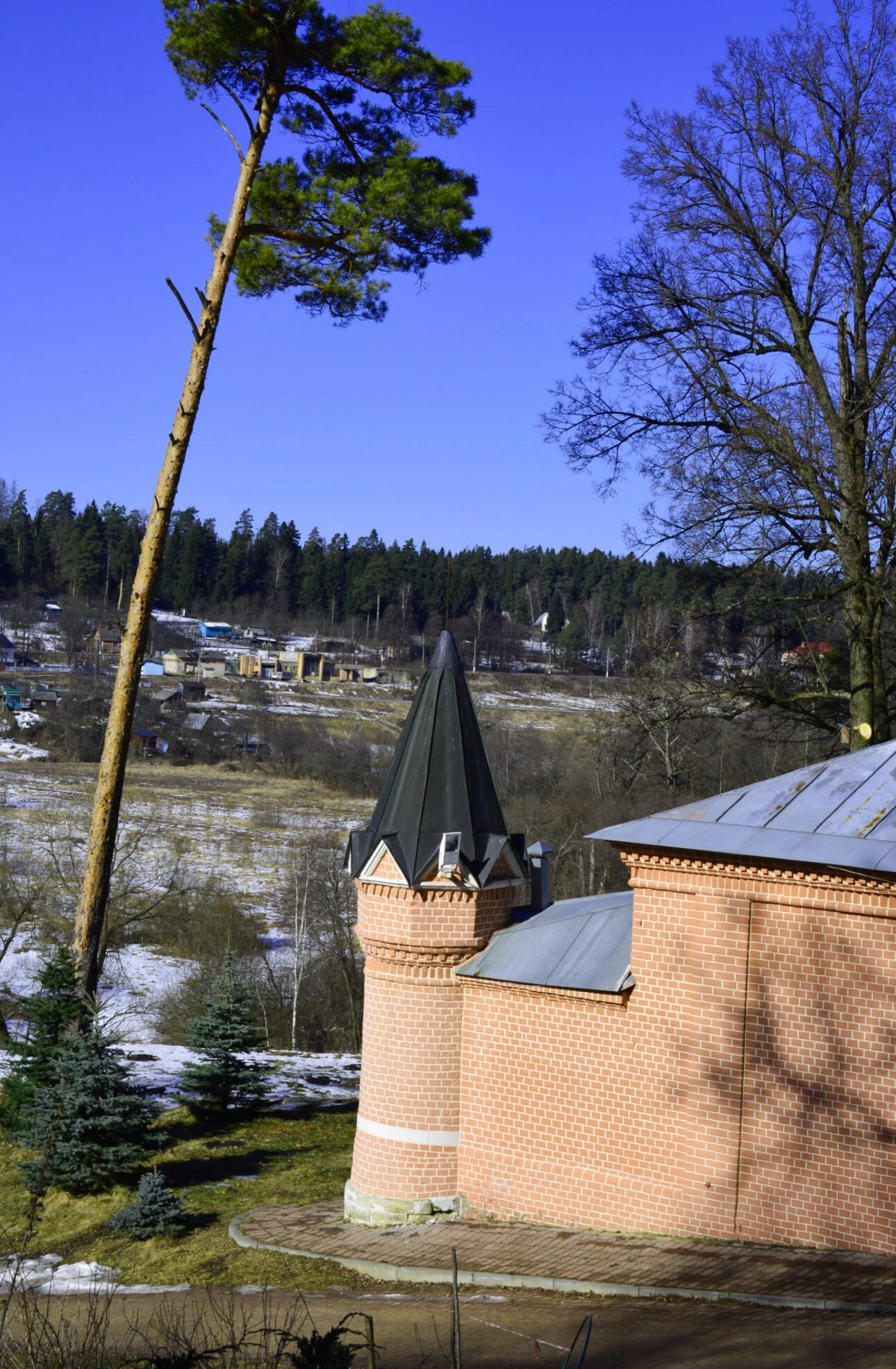 Храмовая территория окружена вековыми деревьями — могучими хвойными и лиственными исполинами, которые в зимний период предстают в своём строгом величии без лиственного убора. На земле местами лежит снежный покров, свидетельствующий о холодном времени года — либо о поздней осени, либо о ранней весне, когда природа пребывает в состоянии благоговейного покоя.