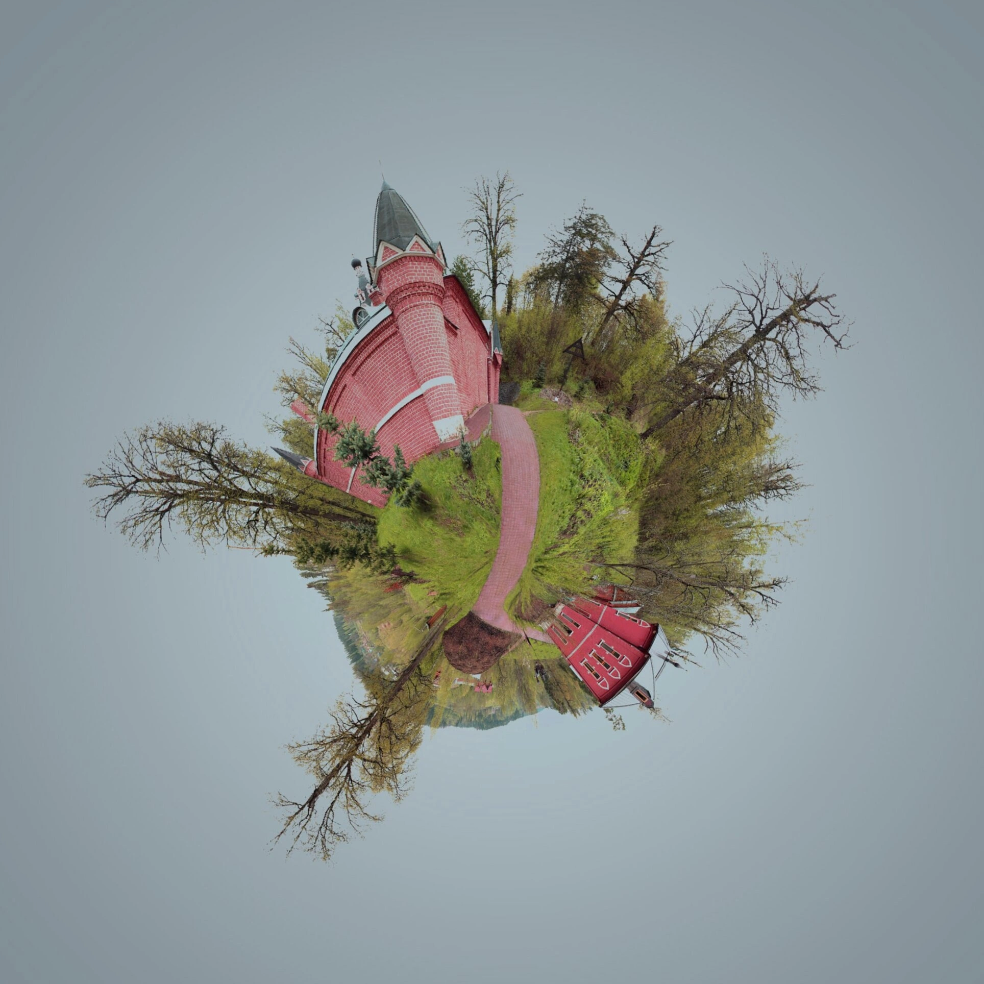 Особенностью данной фотографии является применение специальной панорамной проекции, создающей эффект так называемой 'маленькой планеты'. Благодаря этой технике здание церкви и окружающий его ландшафт визуально образуют сферический мир, где храм становится центром композиции.