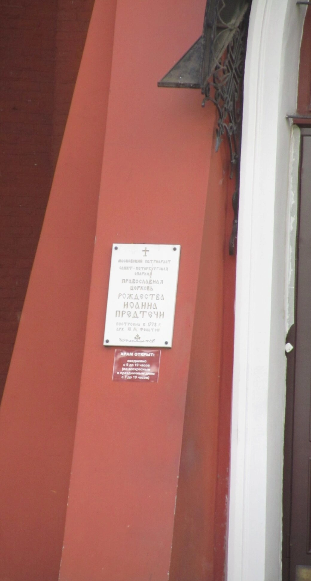 На снимке хорошо просматривается характерная для храма кладка стен красно-коричневого оттенка. Особое внимание привлекают две информационные таблички, закрепленные на стене. Верхняя табличка белого цвета увенчана православным восьмиконечным крестом и содержит надпись: «ПРАВОСЛАВНАЯ ЦЕРКОВЬ РОЖДЕСТВА ИОАННА ПРЕДТЕЧИ». Нижняя табличка темного цвета информирует верующих о времени богослужений с указанием «ХРАМ ОТКРЫТ».