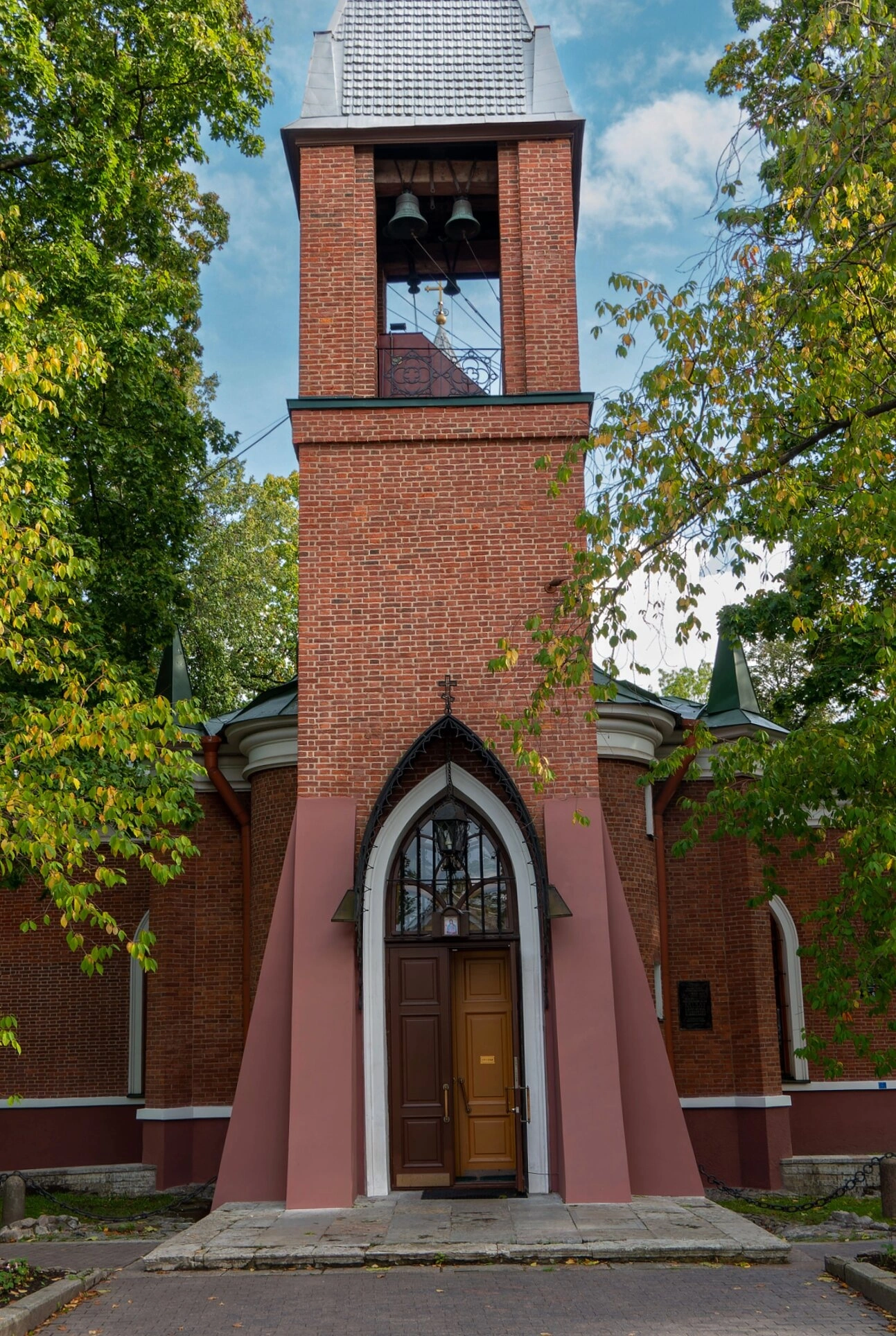 На представленной фотографии запечатлена колокольня и главный вход в Церковь Рождества Иоанна Предтечи, расположенную на Каменном острове в Санкт-Петербурге. Трёхъярусная колокольня, возведённая из красного кирпича, демонстрирует характерные для церковной архитектуры черты. Нижний ярус украшает арочный вход, выполненный в готическом стиле, который ведёт в святая святых храма. Средний ярус представляет собой глухую стену, тогда как на верхнем ярусе расположена звонница, где можно различить два церковных колока.