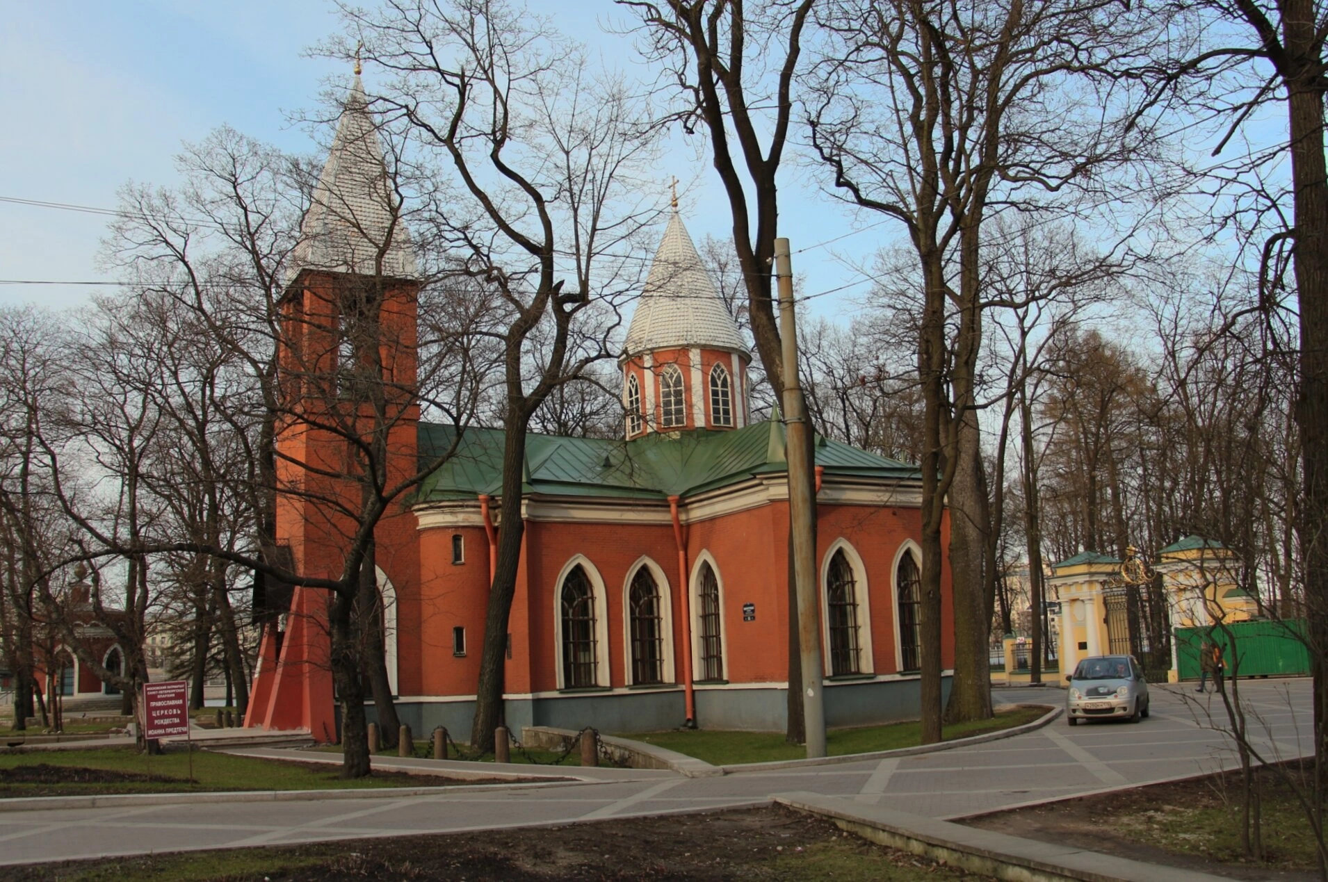 Особого внимания заслуживают оконные проемы храма, выполненные в форме стрельчатых арок, что является отличительной чертой готического стиля в церковном зодчестве. Храм расположен в живописном месте, окруженный деревьями, что создает особую молитвенную атмосферу и способствует уединению. Рядом с церковью проходит асфальтированная дорожка, а на заднем плане виднеются другие городские строения.