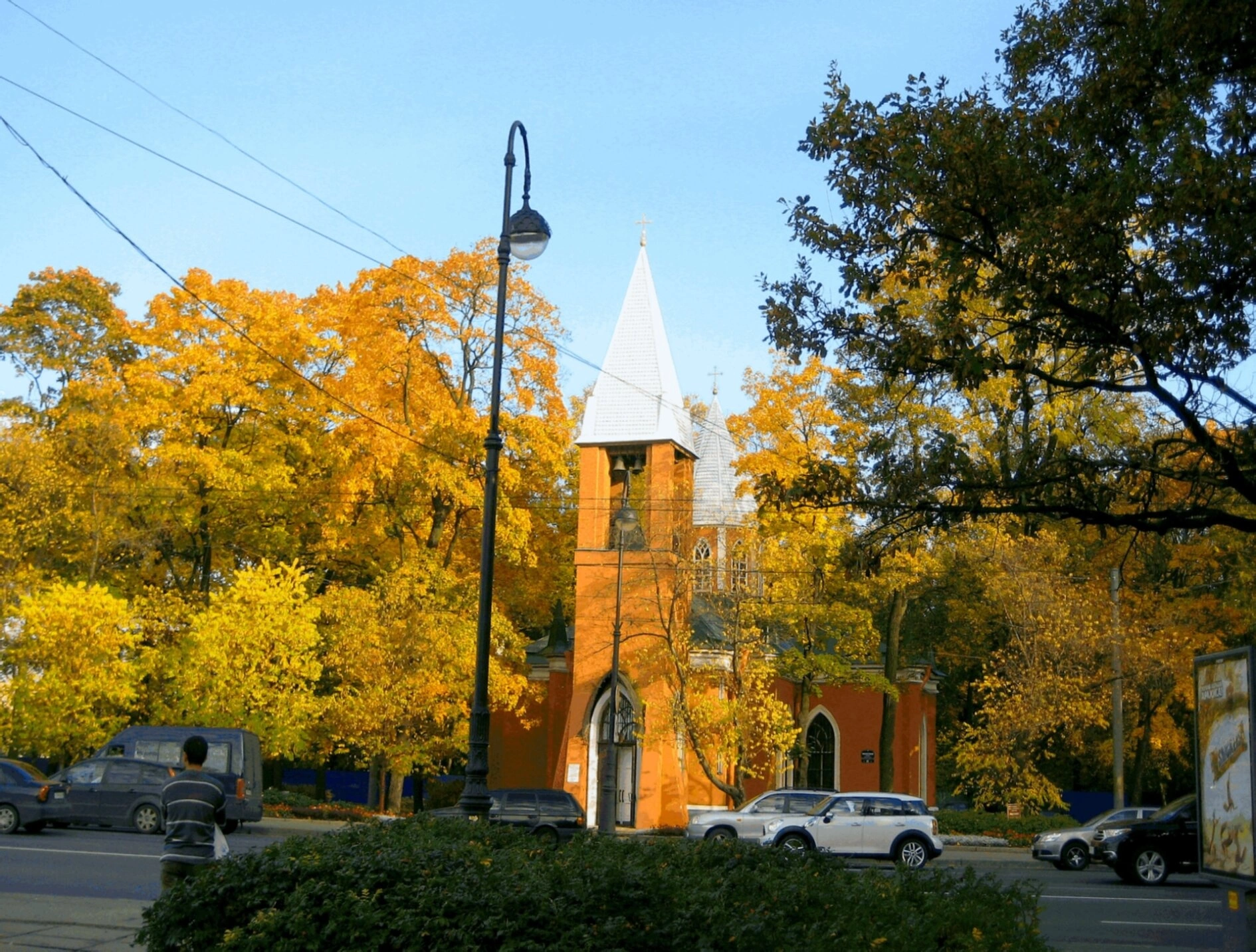 На представленной фотографии запечатлена Церковь Рождества Иоанна Предтечи, расположенная на Каменном острове в Санкт-Петербурге. Святыня, освящённая в честь рождества святого пророка и крестителя Господня Иоанна, предстаёт перед зрителем в осеннем убранстве. Храмовой здание, выполненное в псевдоготическом стиле из красного кирпича, увенчано остроконечным шпилем с золочёным крестом, устремлённым к небесам.