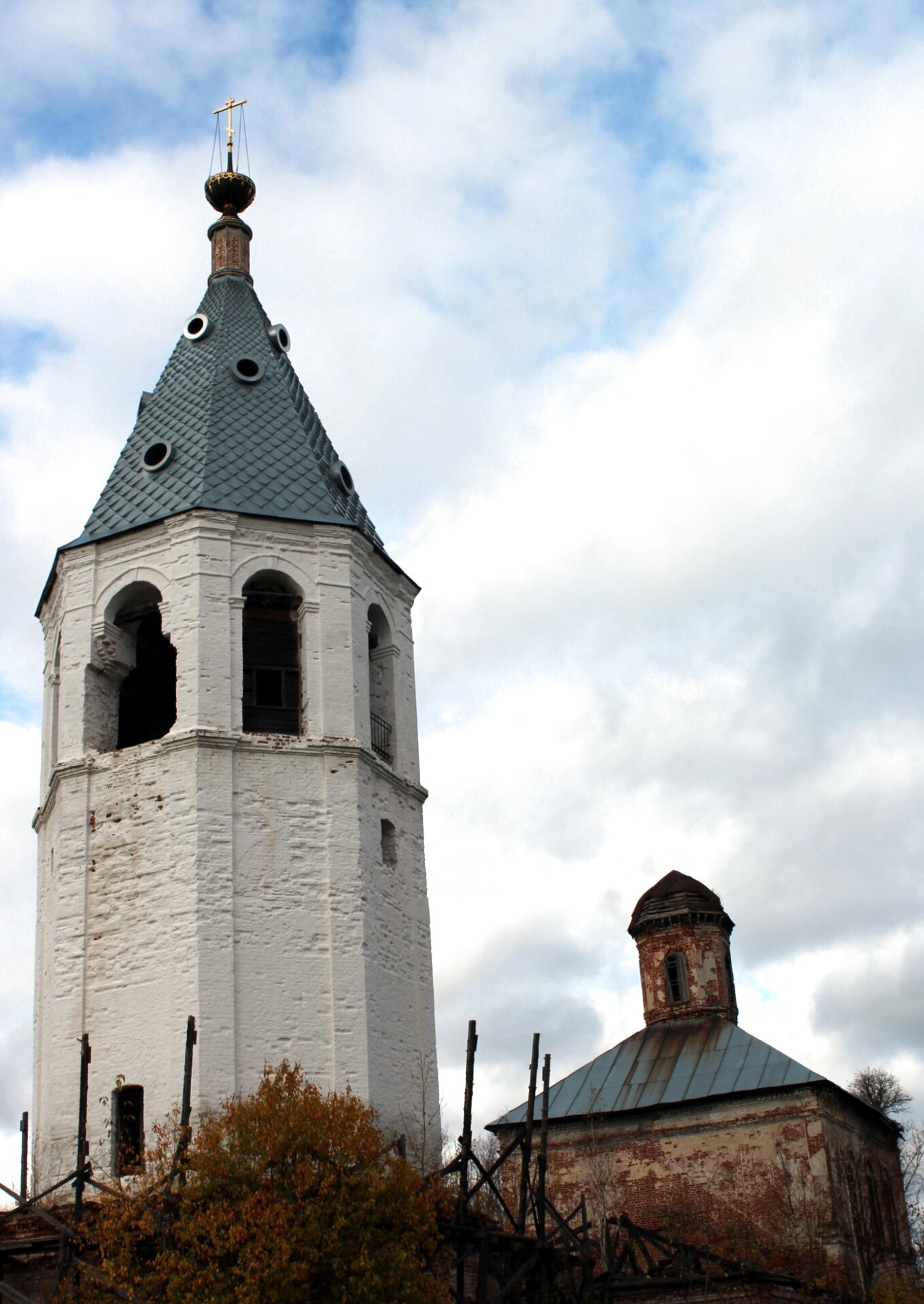 На момент создания фотографии храм находился на реставрации, о чем свидетельствуют установленные строительные леса вокруг колокольни и придела. Проведение восстановительных работ подчеркивает значение этого духовного центра для сохранения культурного наследия Ярославской земли.