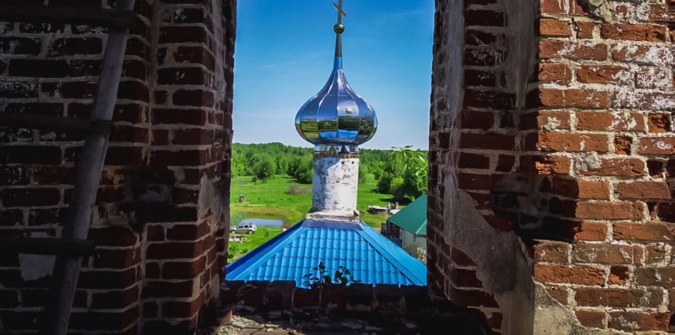 На представленной фотографии запечатлён уникальный вид интерьера Церкви Рождества Иоанна Предтечи, что расположена на посаде старинного города Любим Ярославской области. Снимок выполнен изнутри храмового помещения через арочный проём древней кирпичной стены, вероятно, ведущий в колокольню или один из приделов святыни.