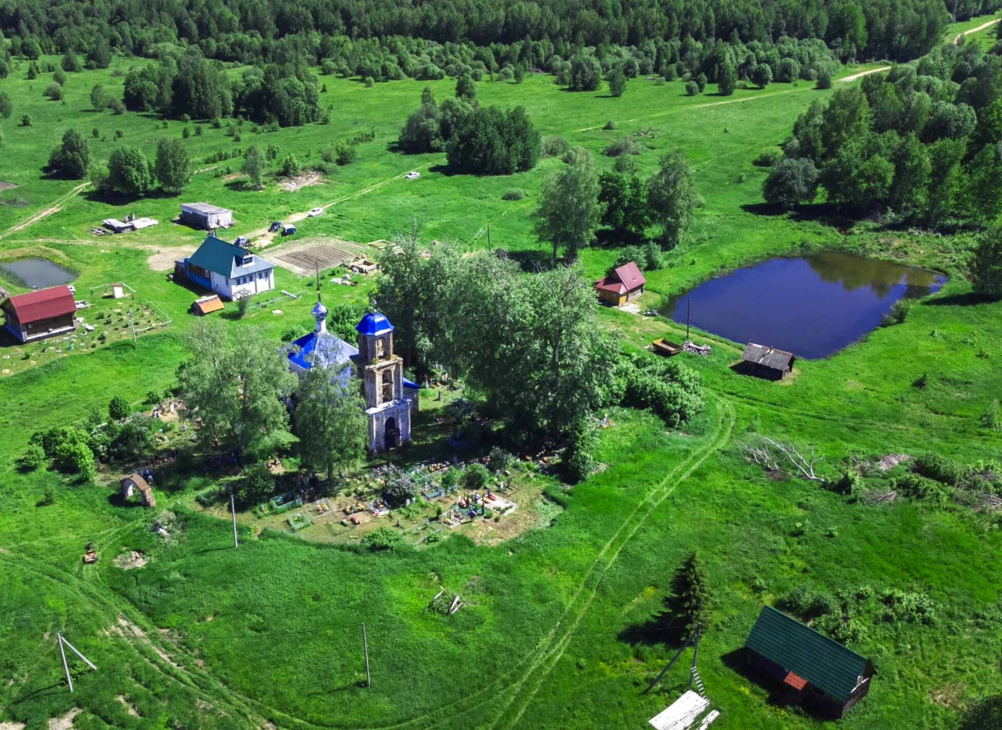 Храм окружён скромными сельскими строениями, что подчёркивает его значение как духовного центра для местных жителей. По обе стороны от церковной территории виднеются два небольших водоёма, отражающие в своих водах купола и кресты, словно напоминая о необходимости очищения души через покаяние.