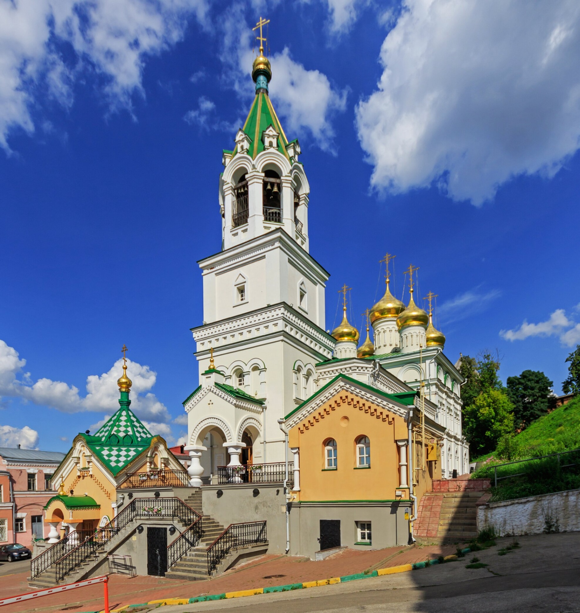 На представленной фотографии запечатлён старинный православный храм — церковь Рождества честного славного Пророка, Предтечи и Крестителя Господня Иоанна, что на Торгу в Нижнем Новгороде. Этот один из древнейших городских храмов располагается в историческом сердце города, на площади Народного Единства, и является неотъемлемой частью его духовного и архитектурного ландшафта.