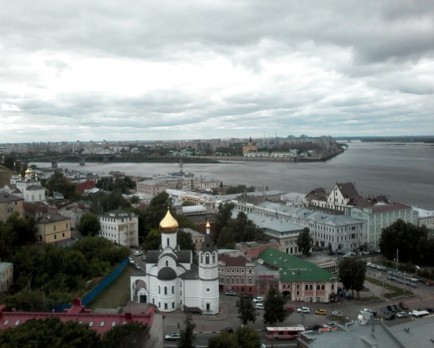 На фотографии запечатлен вид на белоснежный пятиглавый храм Рождества Иоанна Предтечи на Торгу, расположенный у подножия Нижегородского кремля. Церковь, увенчанная золочеными куполами, величественно возвышается на фоне водной глади Волги и городской застройки. Этот уникальный ракурс позволяет оценить гармоничное единство старинной церкви, древней крепостной стены и природного ландшафта.