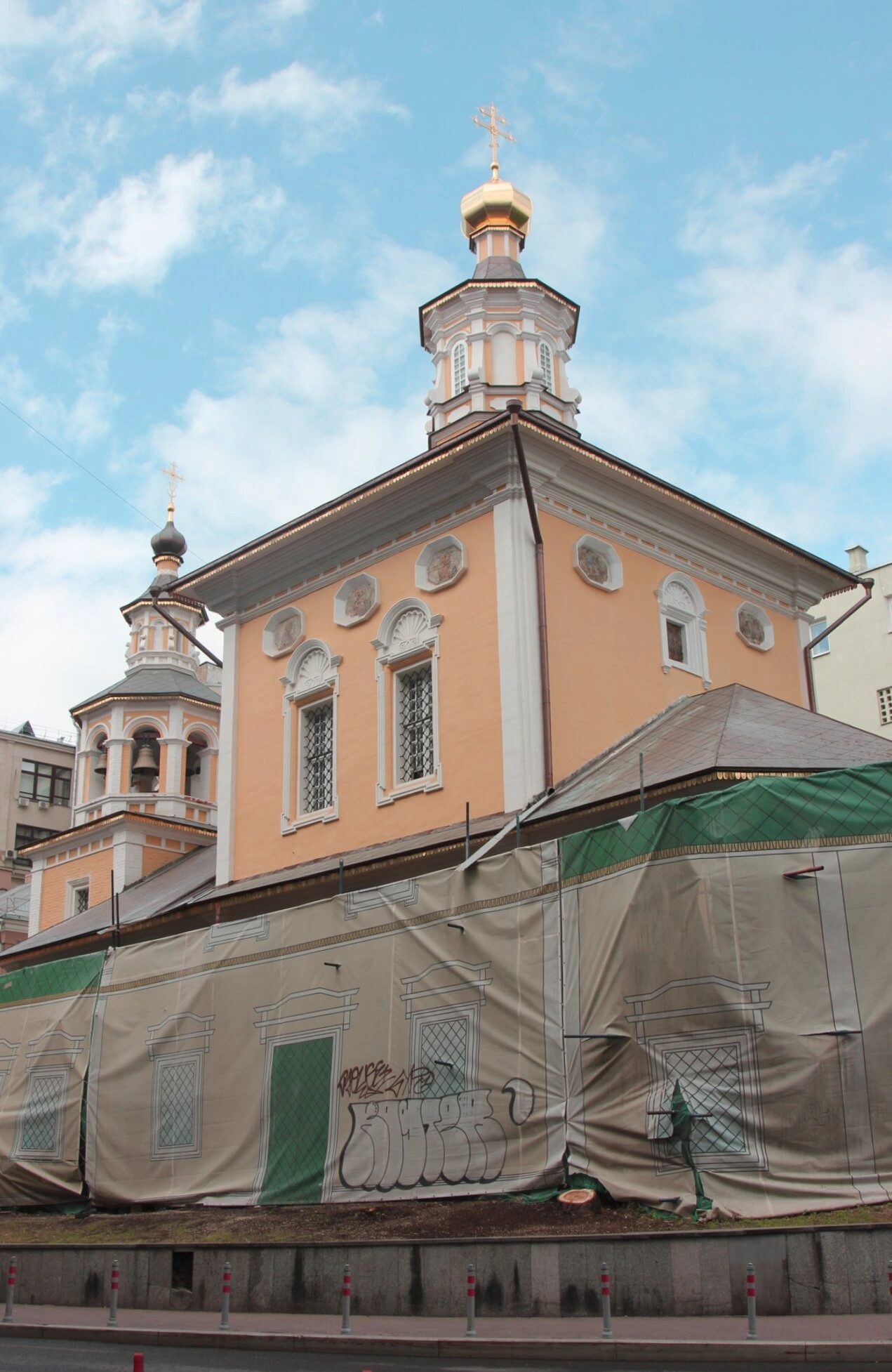 На представленной фотографии запечатлён старинный православный храм — Церковь Рождества святого Иоанна Предтечи, что на Варварке в Москве. Святыня, являющаяся одним из древнейших московских приходов, изображена в процессе проведения реставрационных работ. Жёлтые стены церкви и белоснежные декоративные элементы создают традиционный для русского церковного зодчества колорит. Над основным объёмом здания возвышается стройная шатровая колокольня, увенчанная золочёной главкой с крестом. Главной особенностью кадра являются строительные леса и зелёная защитная сетка, которыми закрыта часть фасада. На сетку нанесён контурный рисунок самого храма, что позволяет паломникам и туристам представить его исторический облик даже во время ведения работ.