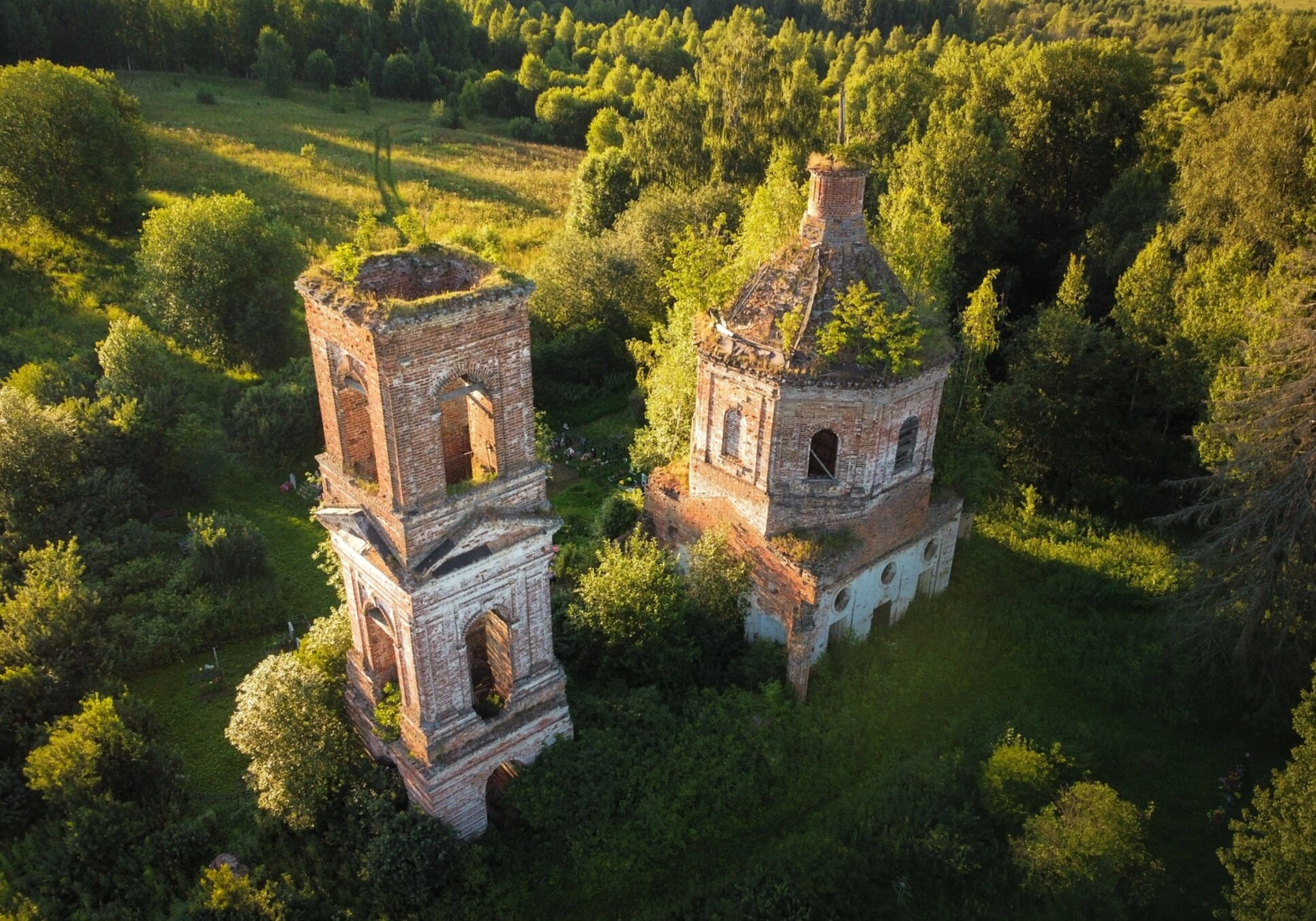 На фотографии запечатлены исторические остатки Церкви во имя Рождества Пророка, Предтечи и Крестителя Господня Иоанна, расположенной на Нижнем посаде города Любима Ярославской области. Храм был возведён в 1769 году и представлял собой уникальный архитектурный комплекс, объединявший летнюю и зимнюю церкви в едином здании. В летнем храме находился престол во имя Рождества Иоанна Предтечи, в то время как в зимней трапезной части располагались два престола: святителя и чудотворца Николая и преподобного Геннадия Любимоградского.