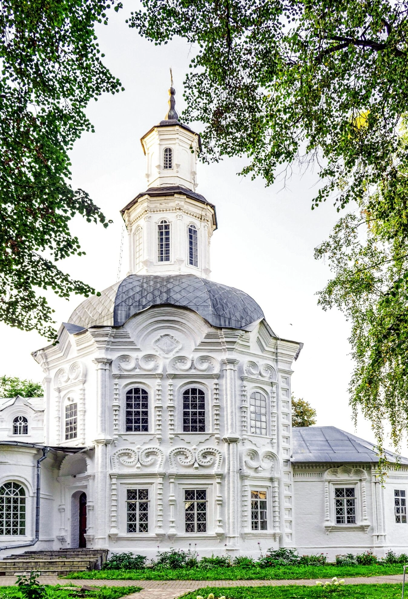 На фотографии хорошо просматривается архитектурная композиция храма, демонстрирующая мастерство вятских зодчих. Отсутствие людей на переднем плане позволяет в полной мере оценить величие церковной архитектуры и сосредоточить внимание на духовной значимости этого святого места.