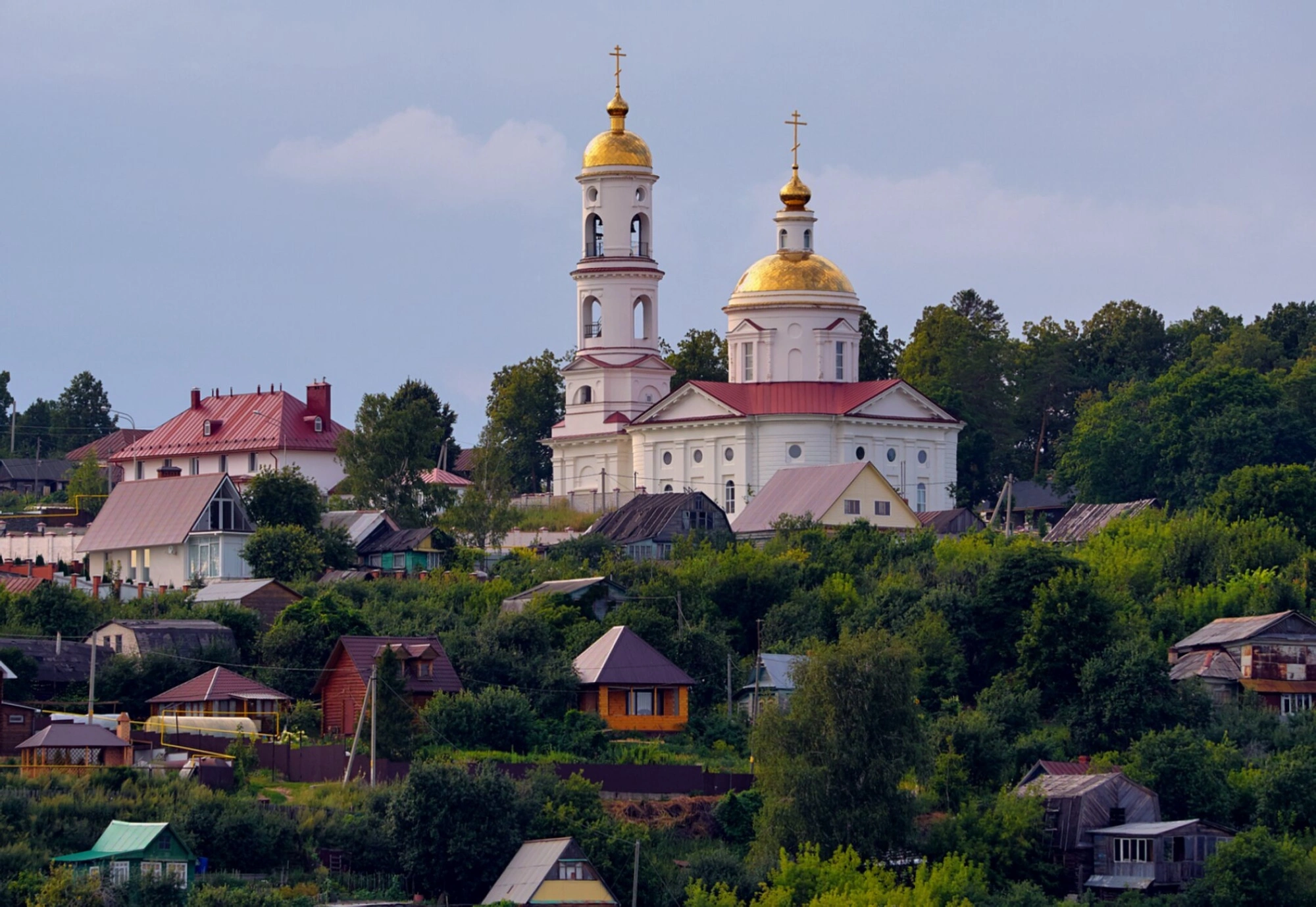 На представленной фотографии запечатлена Церковь Рождества Иоанна Предтечи, расположенная в селе Ключищи на высоком волжском берегу. Храм, возведённый в период с 1797 по 1804 год на средства помещика Павла Петровича Нарышкина, является памятником архитектуры классицизма. Белокаменное здание с двумя позолоченными куполами и высокой колокольней возвышается на склоне холма, доминируя над окружающим пейзажем. Купола увенчаны православными крестами, а основное строение покрыто красной кровлей.