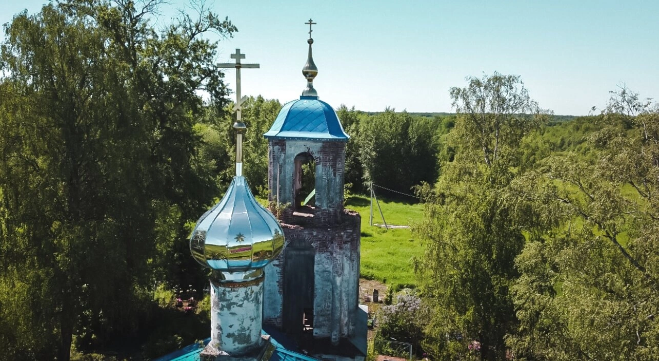 На снимке видна двухъярусная колокольня типа «восьмерик на четверике», увенчанная синим куполом с установленным православным крестом. Рядом располагается еще один купол, покрытый металлом с характерным блеском, также завершенный крестом. Несмотря на признаки частичного разрушения, основные архитектурные элементы и купольные завершения сохранили относительно благоприятное состояние.