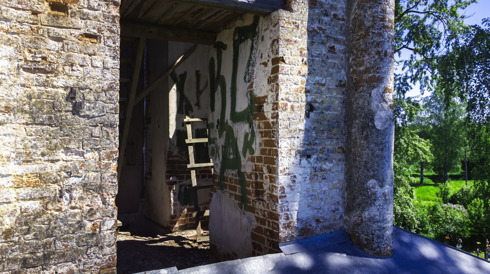 Архитектура храма демонстрирует характерные для русского церковного зодчества черты. Основной материал строения — красный кирпич, частично сохранивший первоначальное покрытие из белой штукатурки. К сожалению, в настоящее время здание пребывает в аварийном состоянии, о чем свидетельствуют многочисленные следы разрушения, трещины в кладке и осыпавшаяся штукатурка. Внутри дверного проема виднеются современные граффити, что контрастирует с сакральным назначением места.