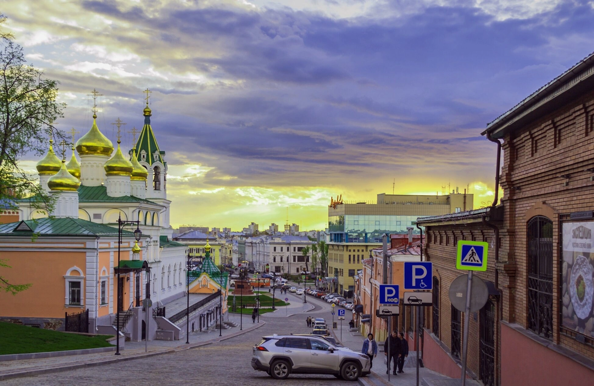 На представленной фотографии запечатлён величественный вид на Церковь Рождества Святого Иоанна Предтечи, что располагается в историческом центре Нижнего Новгорода, на площади Народного Единства. Храм, освящённый в честь пророка и крестителя Господня Иоанна, является одной из самых почитаемых и узнаваемых святынь города.