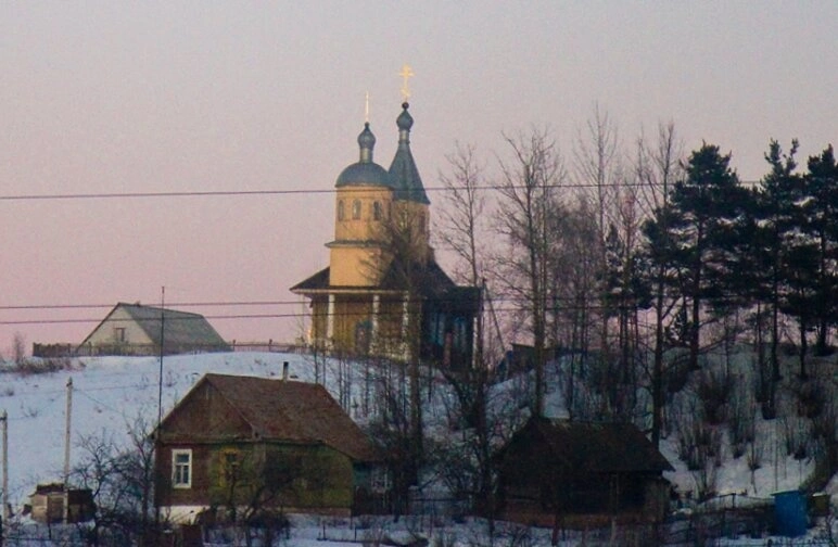 Фотография передаёт умиротворённую атмосферу зимнего дня. Храм, окружённый оголёнными ветвями деревьев и скромными жилыми постройками, стоит в безмолвной молитве. Чистый снег подчёркивает изящные формы деревянных конструкций и тёплый цвет стен, а тёмные кресты на фоне светлого неба устремляются ввысь, символизируя надежду и вечную жизнь. Этот образ служит напоминанием о незыблемости веры и красоте православной культуры, сохраняемой в белорусской земле.