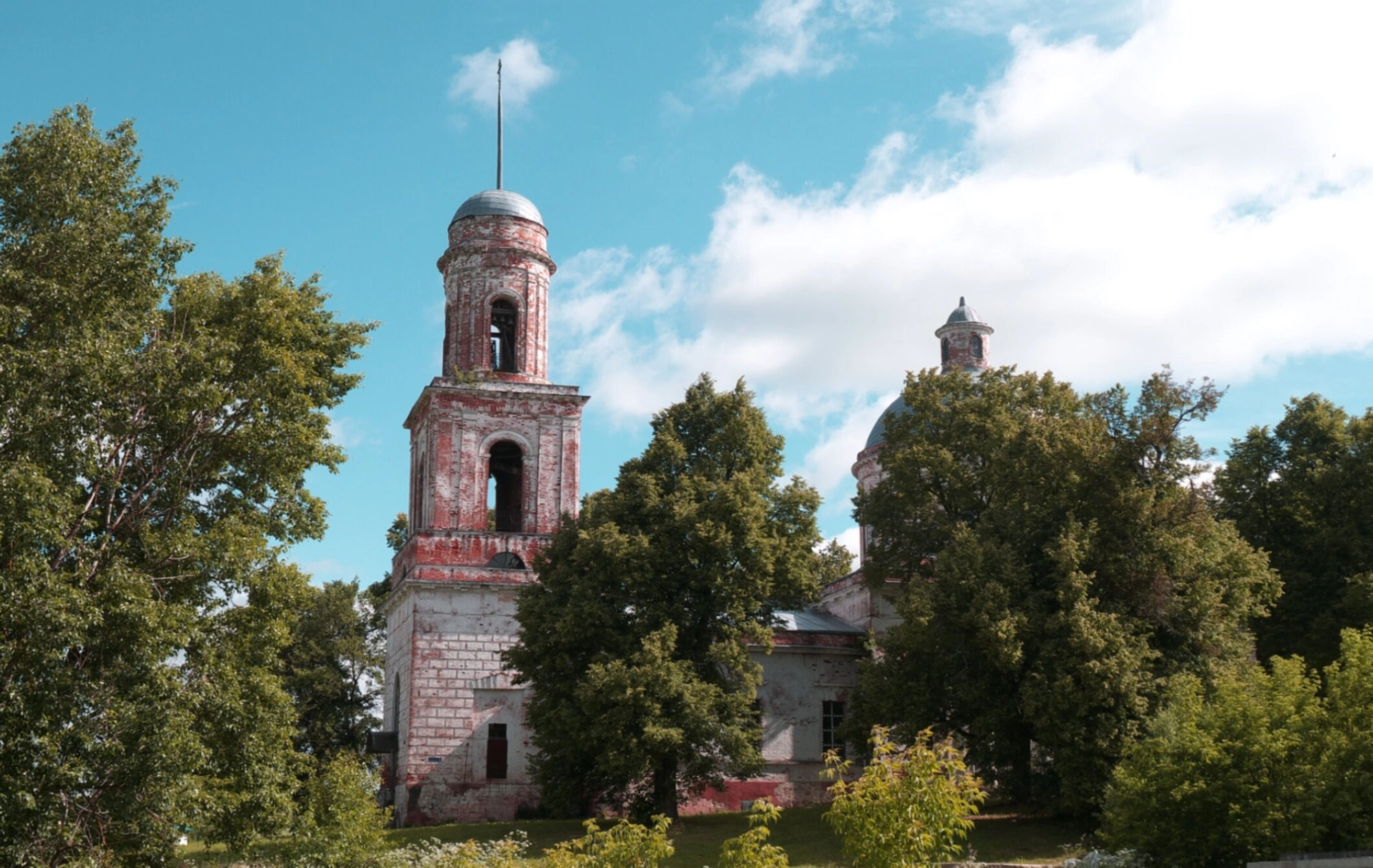 Вокруг церковного строения разрослись высокие деревья и кустарник, что подчёркивает заброшенность этого некогда благодатного места. Несмотря на плачевное состояние, храм сохраняет свои величественные пропорции и особую духовную атмосферу. Снимок сделан в ясный день под чистым голубым небом с белыми облаками, что добавляет кадру величия и светлой печали.