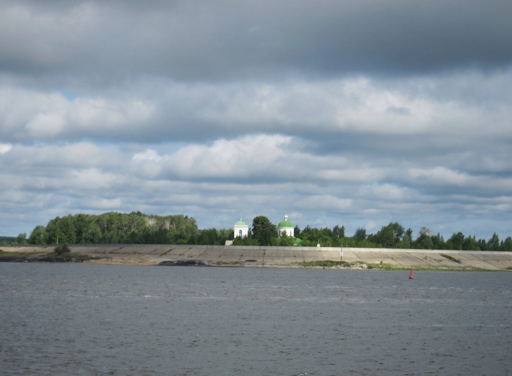 На фотографии запечатлена Церковь Рождества святого Пророка, Предтечи и Крестителя Господня Иоанна, возвышающаяся на левом берегу реки Волги в бывшем селе Коротни Горномарийского района Республики Марий Эл. Храм стоит в уединении за мощной защитной дамбой, что создаёт образ одновременно скорбный и величественный, напоминая о минувших временах.