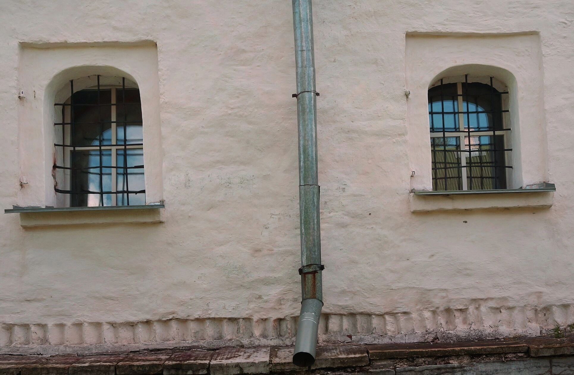 Симметрично по обе стороны от вертикальной водосточной трубы расположены два арочных окна, характерных для церковной архитектуры. Окна обрамлены гладкой штукатуркой и защищены коваными металлическими решетками, состоящими из вертикальных и горизонтальных прутьев. За решетками просматриваются отражения небесной лазури, что создает эффект связи земного храма с горним миром.